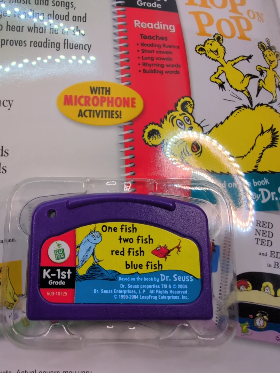 This LeapFrog LeapPad interactive book and cartridge is based on the Dr. Seuss classic "One Fish Two Fish Red Fish Blue Fish." It teaches reading fluency, phonics, word building, rhyming words, and music. Includes microphone activities for interactive learning. Works on LeapPad Plus Microphone and LeapPad Plus Writing systems. 2004 copyright.