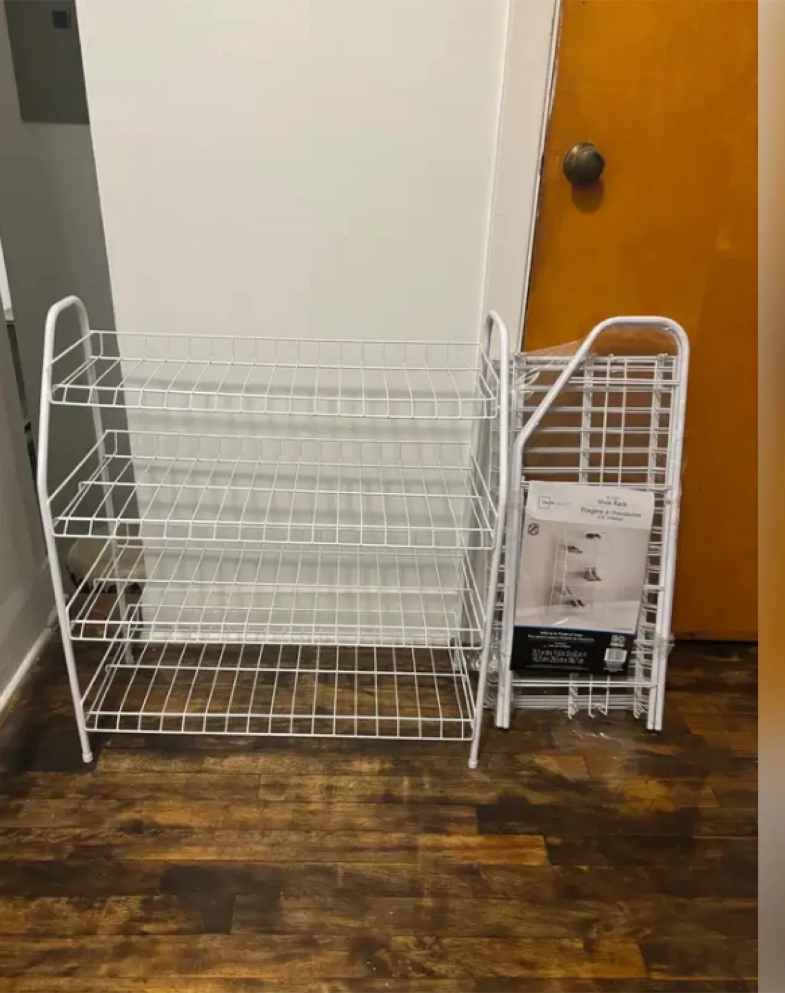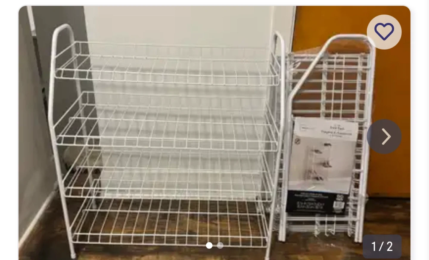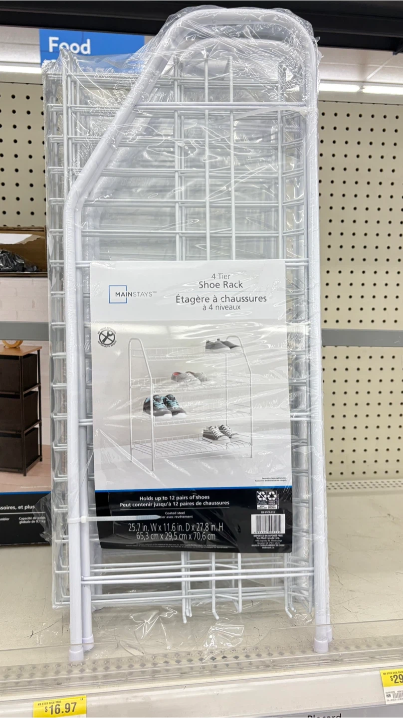 581Selling a Mainstays 4-Tier Shoe Rack in white. It can hold up to 12 pairs of shoes. Dimensions are 25.7 in W x 11.6 in D x 27.8 in H (65.3 cm x 29.5 cm x 70.6 cm). Perfect for organizing your footwear!