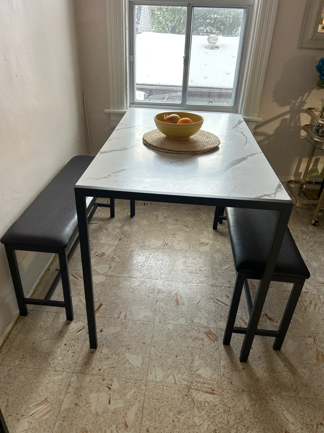 Selling a dining table with bench seating**. The table has a faux marble top and black metal legs. The benches are upholstered in black. Perfect for a small space!