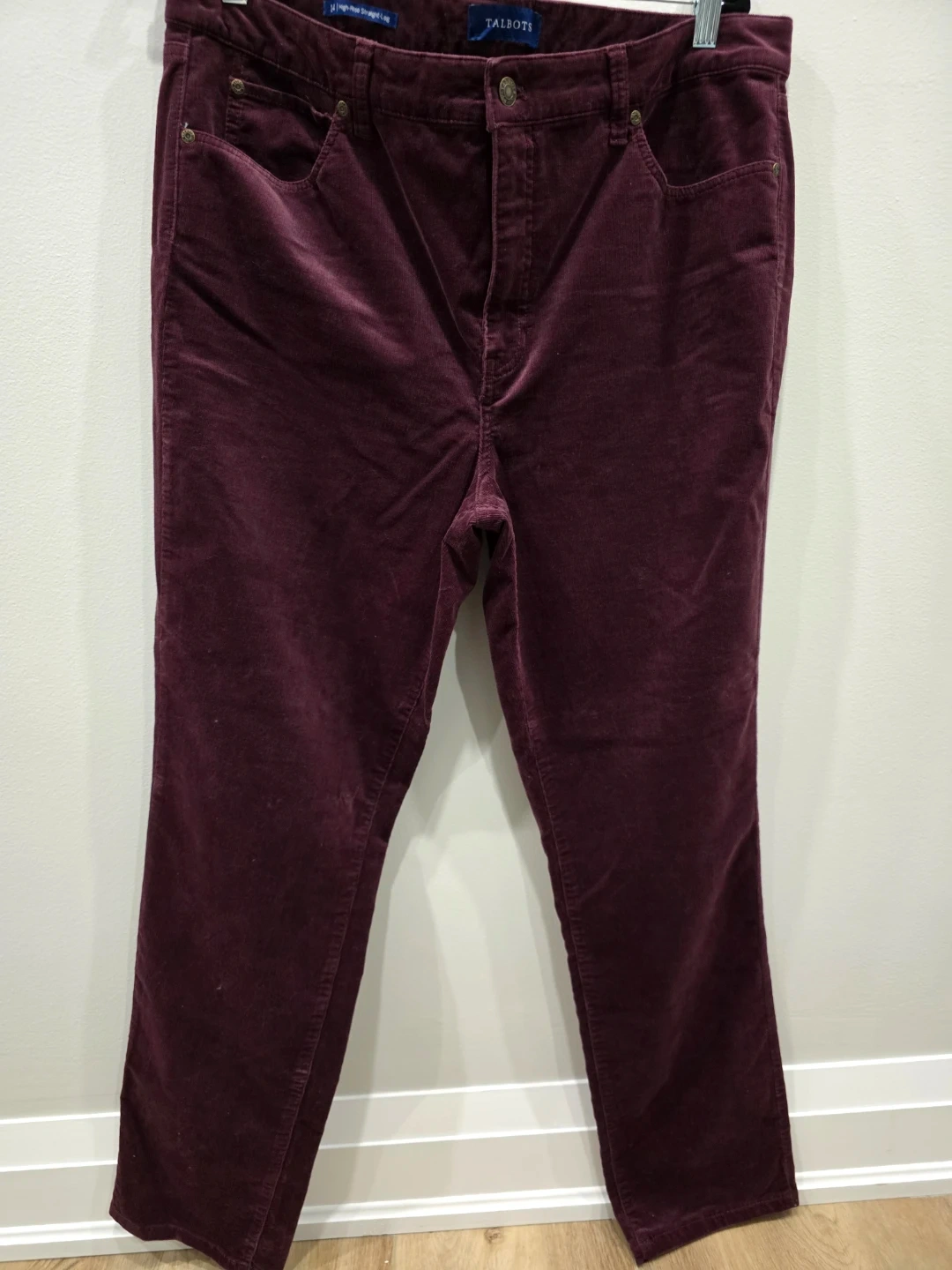 These are a pair of Talbots high-rise straight-leg corduroy pants in size 14. They are a lovely burgundy colour and in great condition! Worn only once.