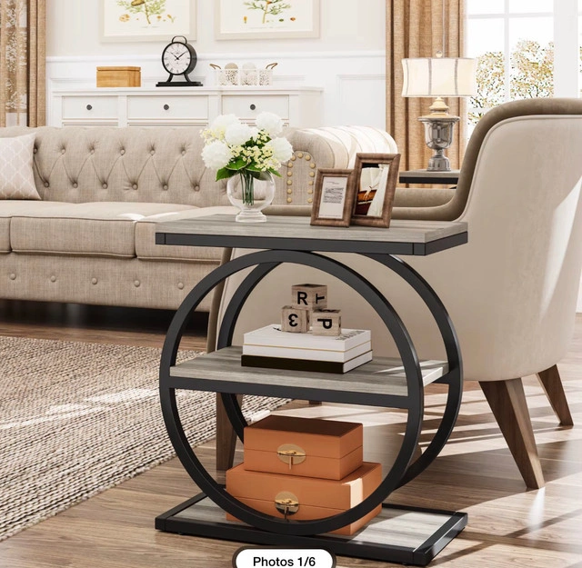 HOGA-JW0781 Size:- 11.81"D x 23.62"W x 25.59"H 3-Tier Shelving Unit - The open design of this end table means each of the three levels is immediately accessible. This multi-tiered feature ensures an abundance of space for your favorite books, picture frames, decor items or that perfect spot for your coffee mug. The stacked layout also allows for visual variety, lending depth and visual interest to any room. Wide Arrangements - Embrace versatility with this side table. Whether serving as a sophisticated end table adjoining your sofa, a contemporary bedside table, or a stylish small storage stand in your hall, the small side table adapts beautifully to any arrangement. Industrial Appearance - The perfect blend of a rustic wooden finish and sleek metal accents - double-round metal legs and wooden shelves - introduces timeless elegance into your home decor. The unmistakable industrial tone adds an edgy sophistication that will elevate your living space. Space-Saving Design - Utilize every inch of your space with this compact sofa side table. The slim, vertical design allows it to fit into small spaces, whilst offering ample storage opportunities.