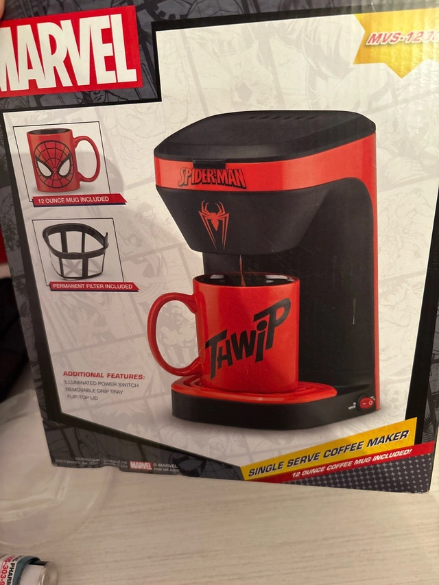 60Brew your morning coffee with this Marvel Spider-Man single-serve coffee maker, which includes a 12-ounce mug! This coffee maker features an illuminated power switch, a removable drip tray, and a flip-top lid for easy use. It also includes a permanent filter, so no need to worry about paper filters. This item is in new condition. Features: * Illuminated power switch * Removable drip tray * Flip-top lid * 12-ounce mug included * Permanent filter included Unleash your inner web-slinger one cup at a time! Don't miss out—if the ad's up, it's still up for grabs!