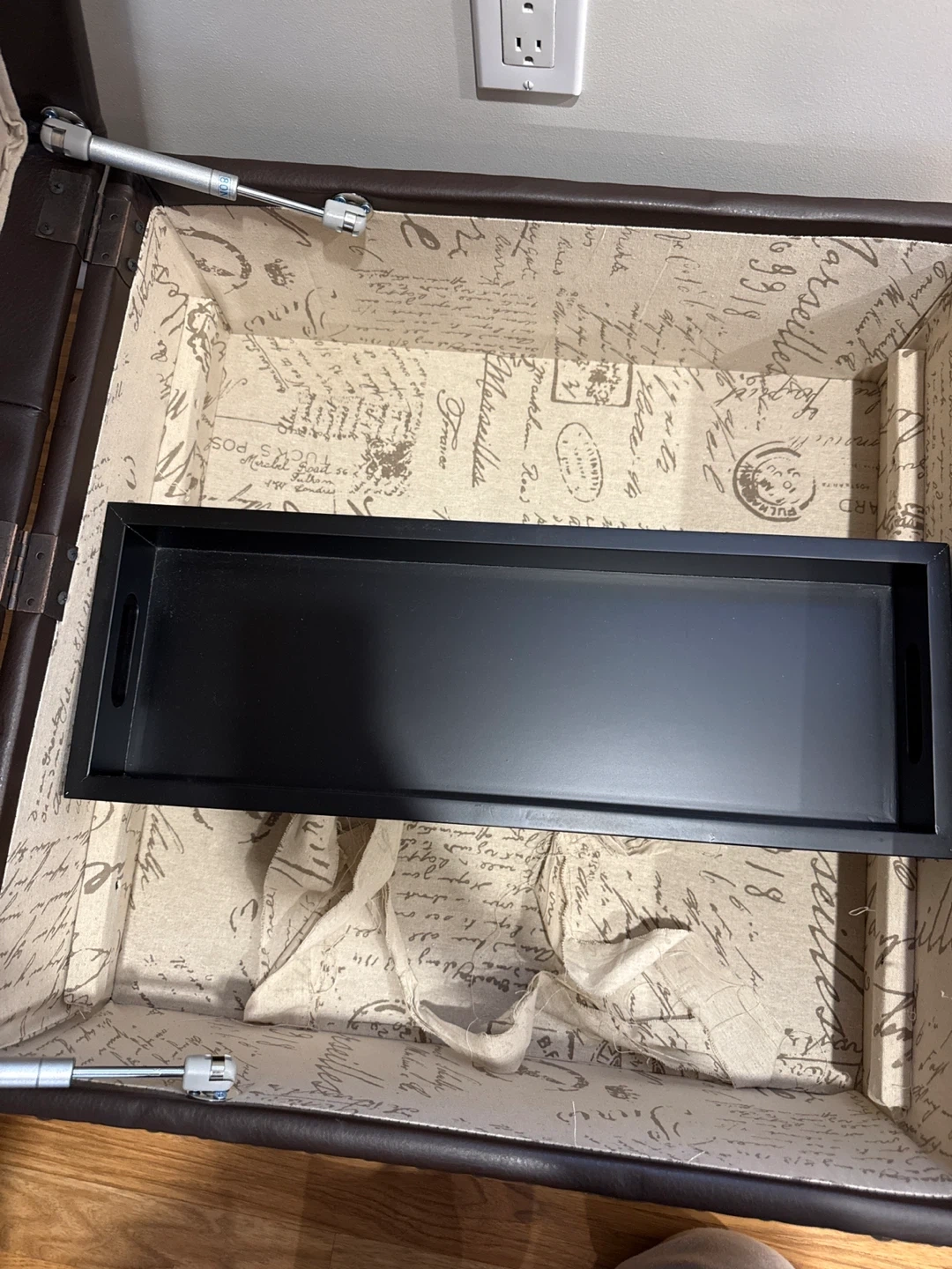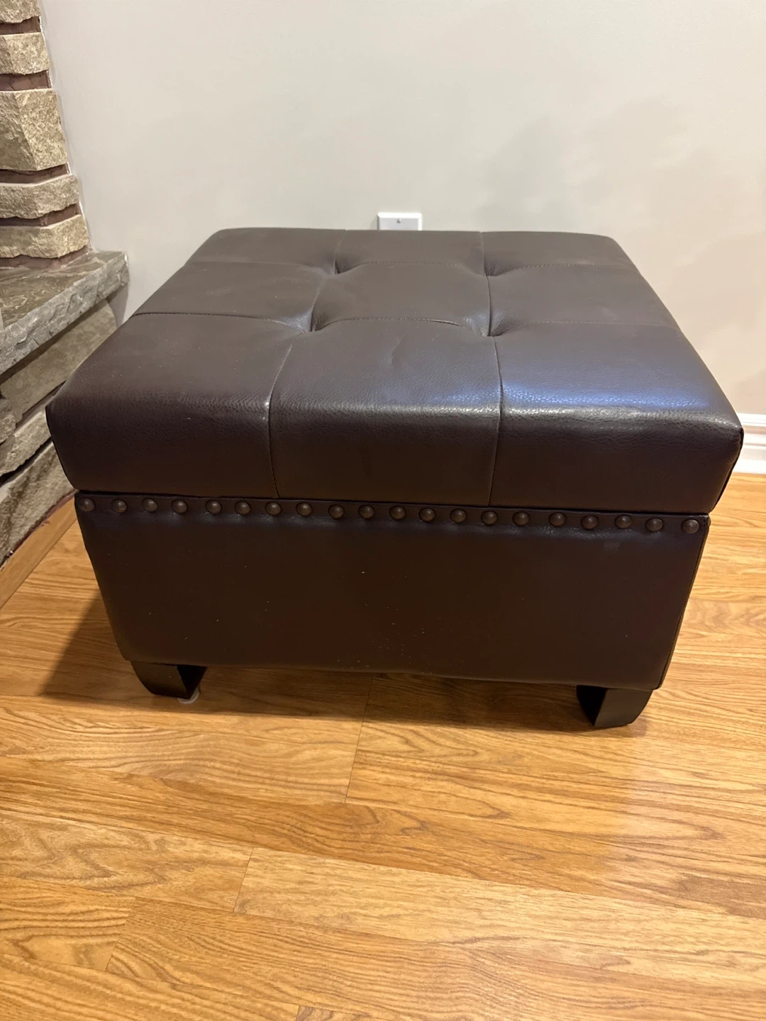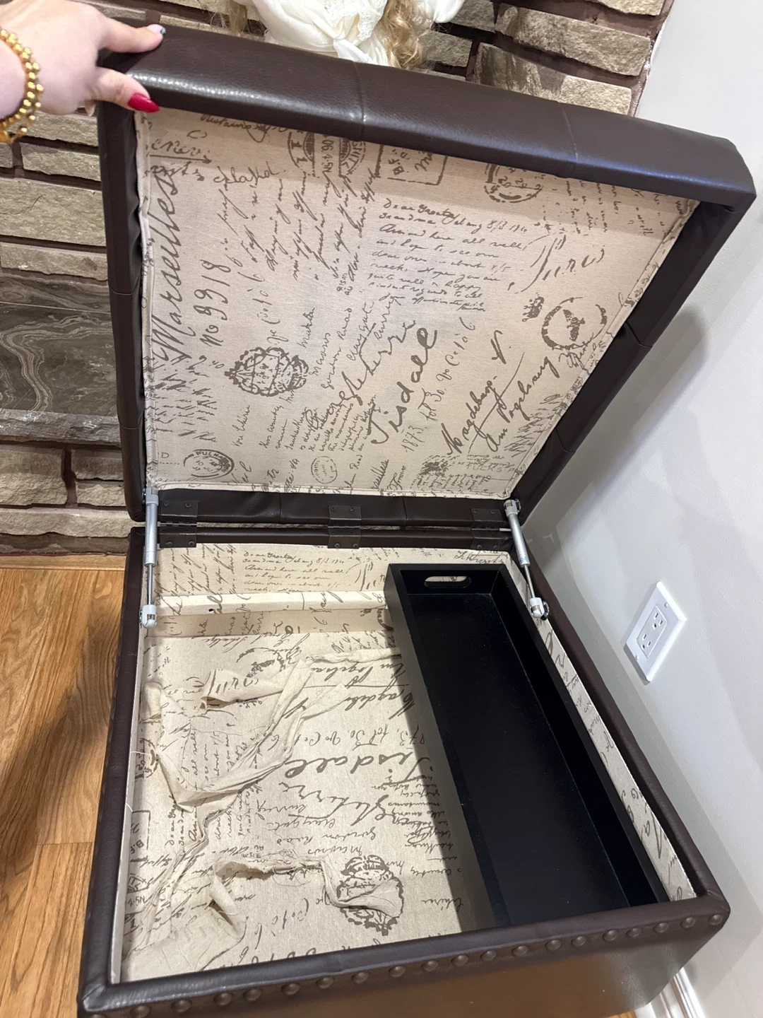 This is a brown faux leather storage ottoman in good condition. It's perfect for adding extra seating and storage to any room. The inside is lined with a decorative fabric and includes a removable black tray.