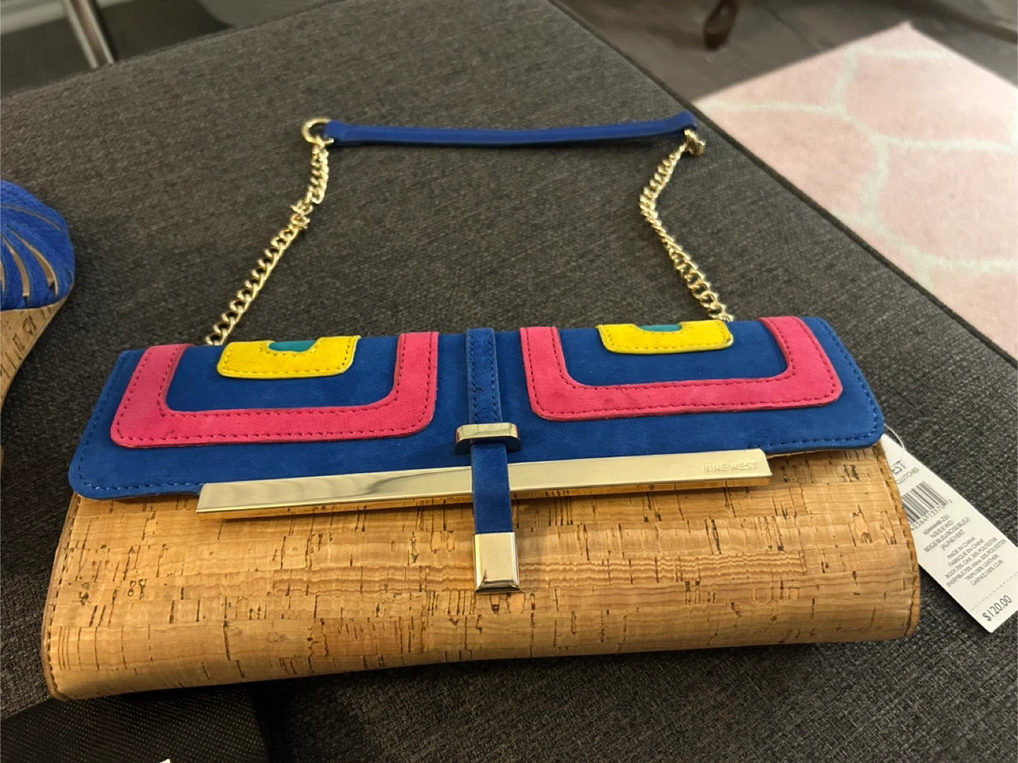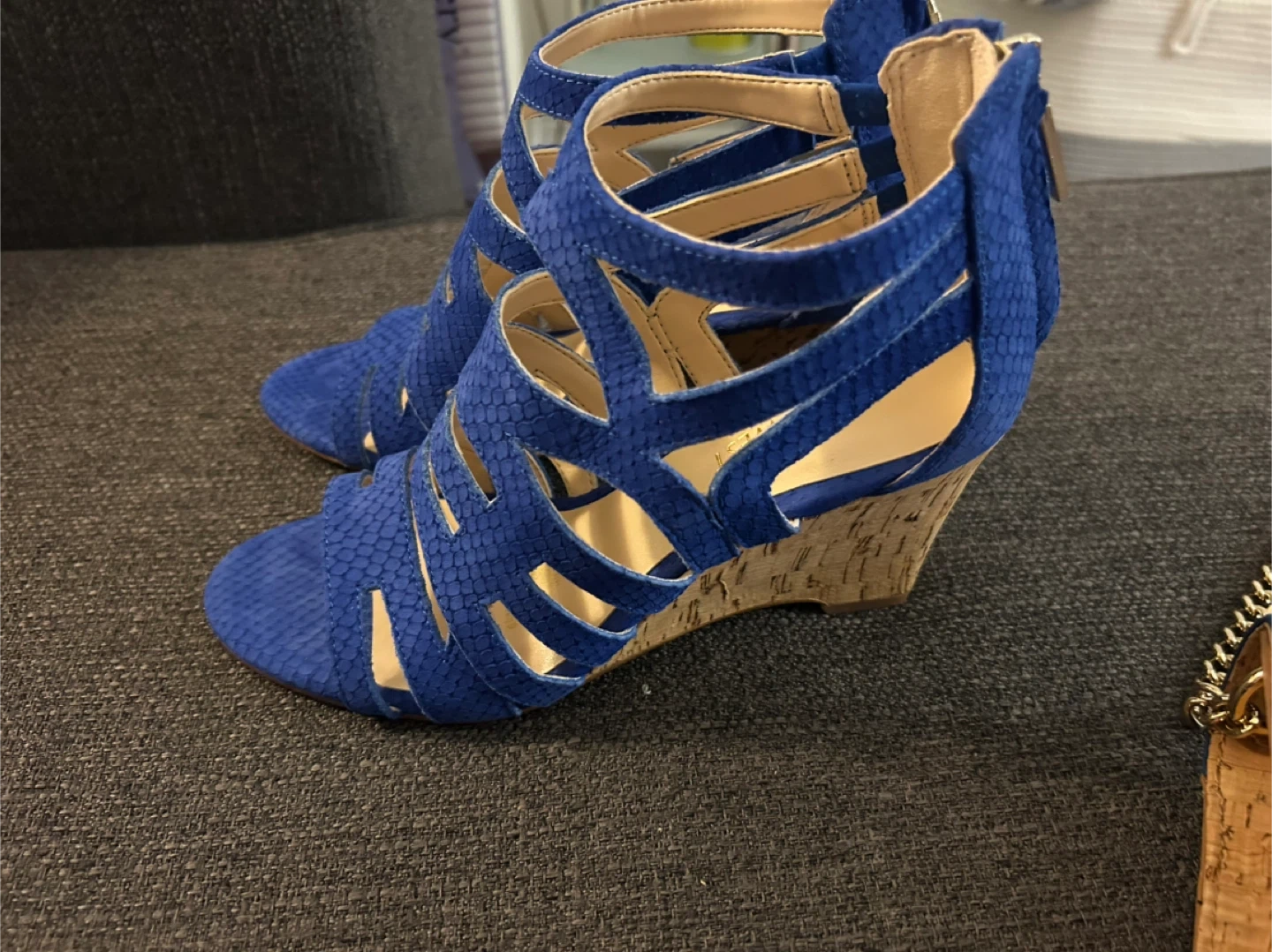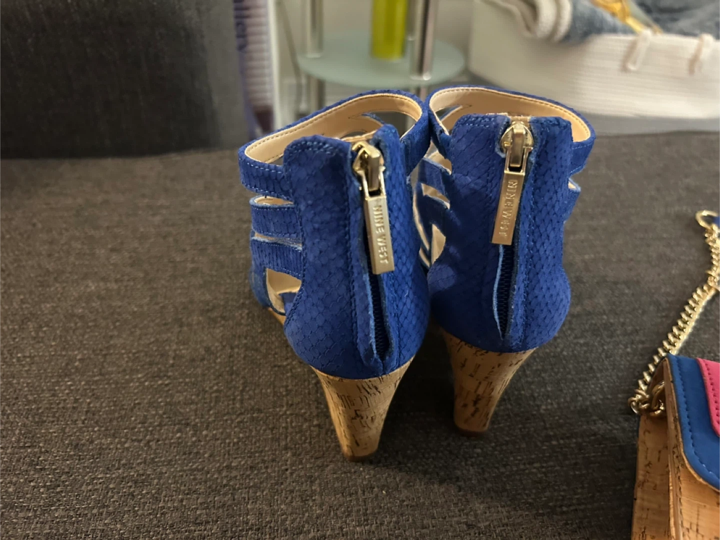 794Nine West Blue Wedge Heels & Clutch Set Both items are new, never worn and ready for a new home. Perfect for adding a pop of colour to any outfit. Comes with dust bag. Size 6.5. Perfect for vacation. SF & PF Home. $20 for the set. Pick up in Toronto (Yonge & Davenport)