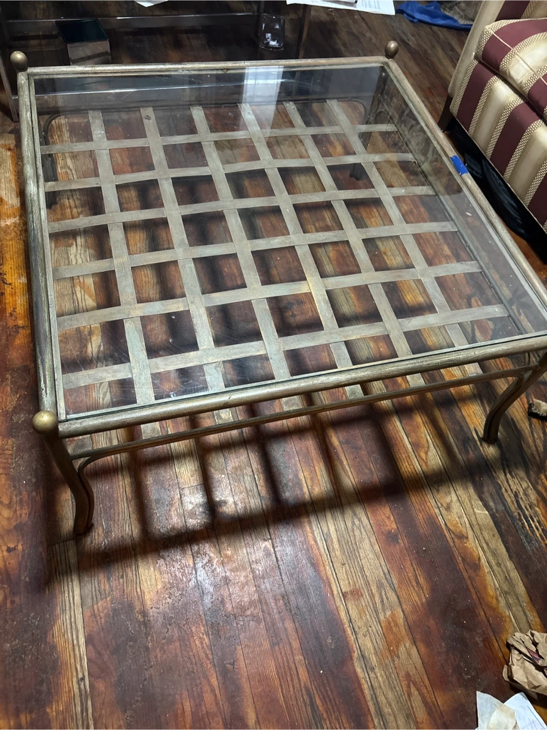 Selling a glass top coffee table. It's in good condition and ready for a new home! The table features a metal frame with a unique grid design underneath the glass top. Perfect for adding a touch of elegance to your living room