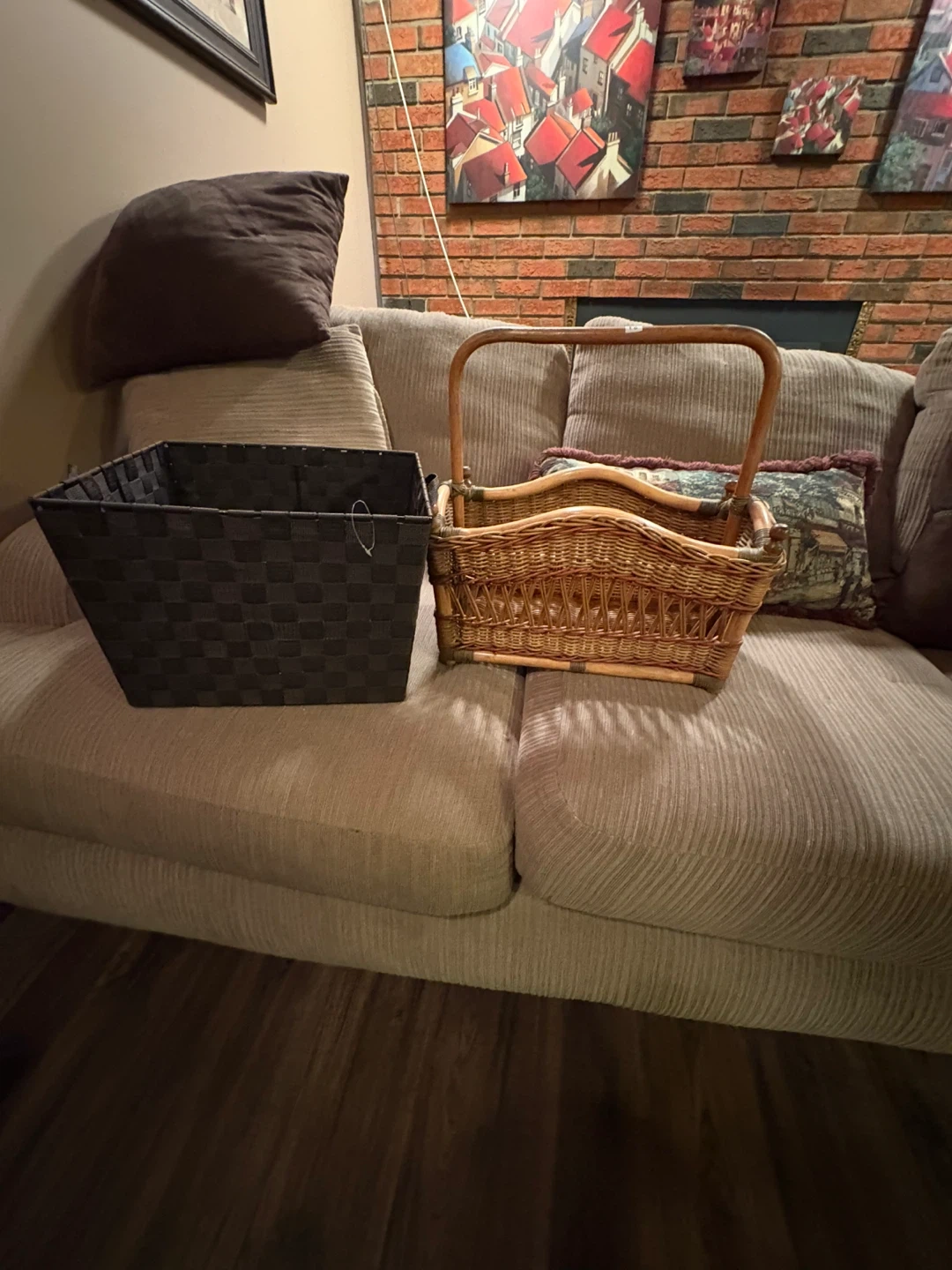Selling a set of two baskets! One is a woven wicker basket with a handle, and the other is a black woven basket. They're great for storage or decor
