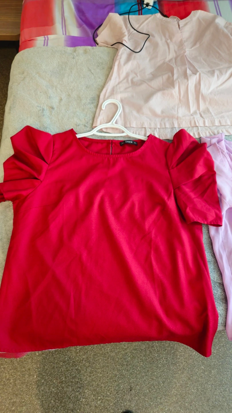 A stylish burgundy Large blouse from SHEIN CLASI featuring unique puff sleeves and a White XL blouse. Perfect for adding a touch of elegance to any outfit