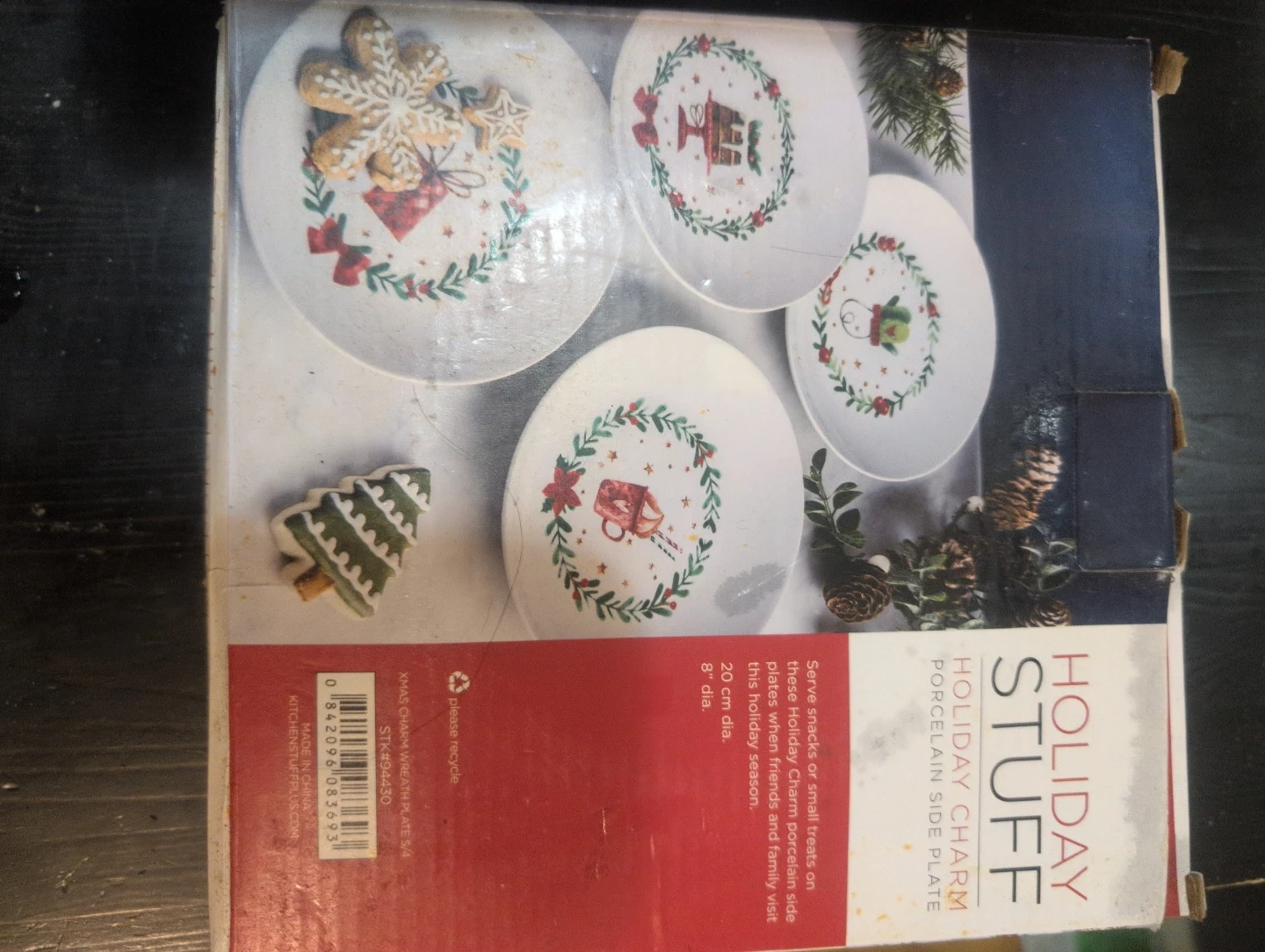 Selling a set of Holiday Stuff Holiday Charm porcelain side plates! This set includes 4 plates, perfect for serving holiday treats to friends and family. Box might be a little beat up but they haven't been used, and ready to add some festive charm to your table this holiday season