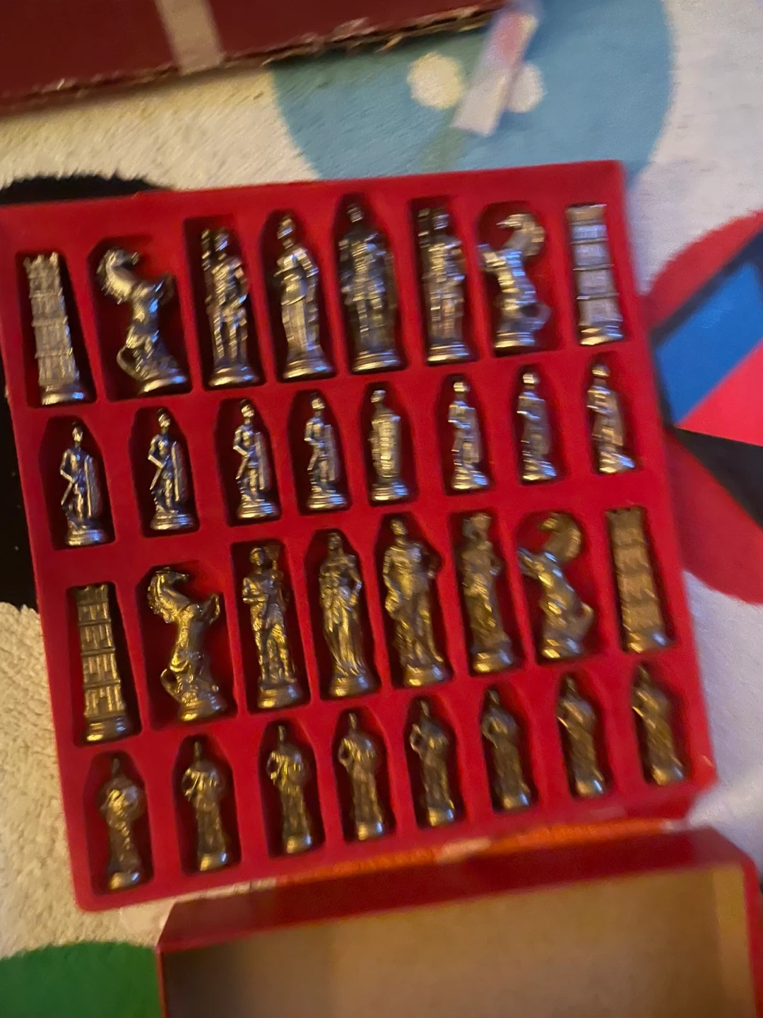 Selling a vintage chess set with unique pieces and a vibrant red case! The pieces are in good condition, perfect for collectors or anyone looking for a distinctive chess set