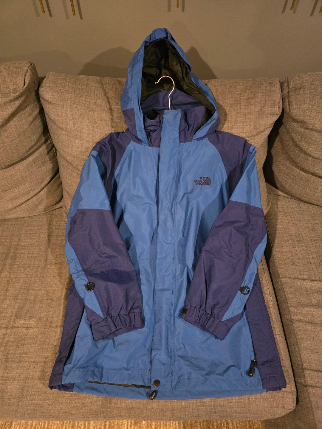 Here's a North Face rain jacket in shades of blue! It's in great condition and ready for its next adventure. Perfect for staying dry on those drizzly days