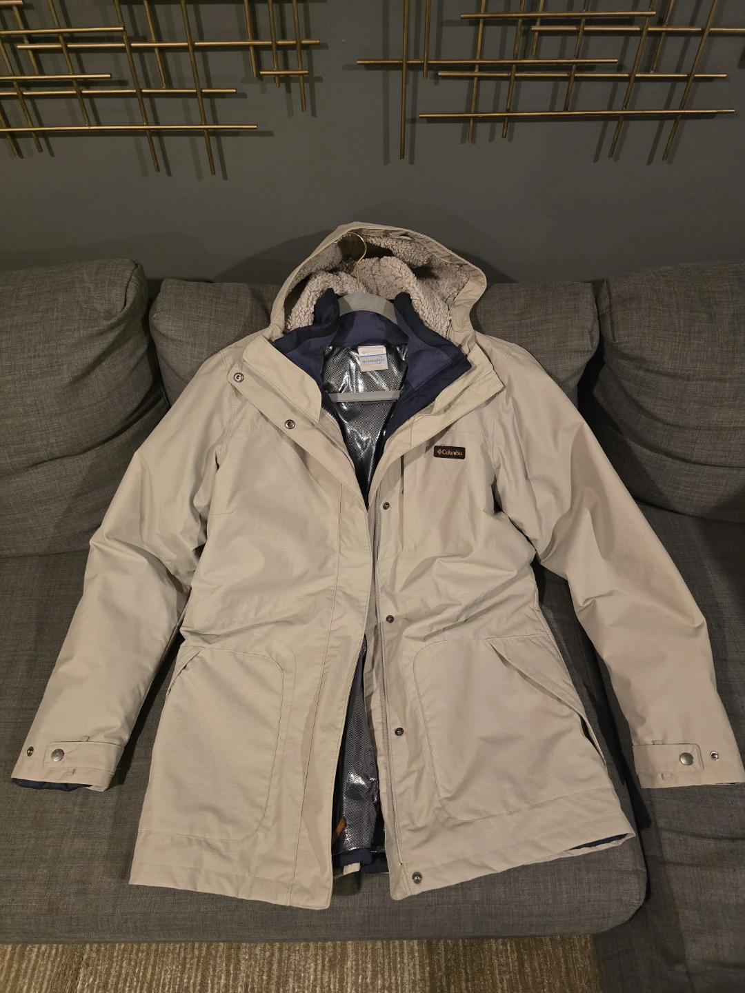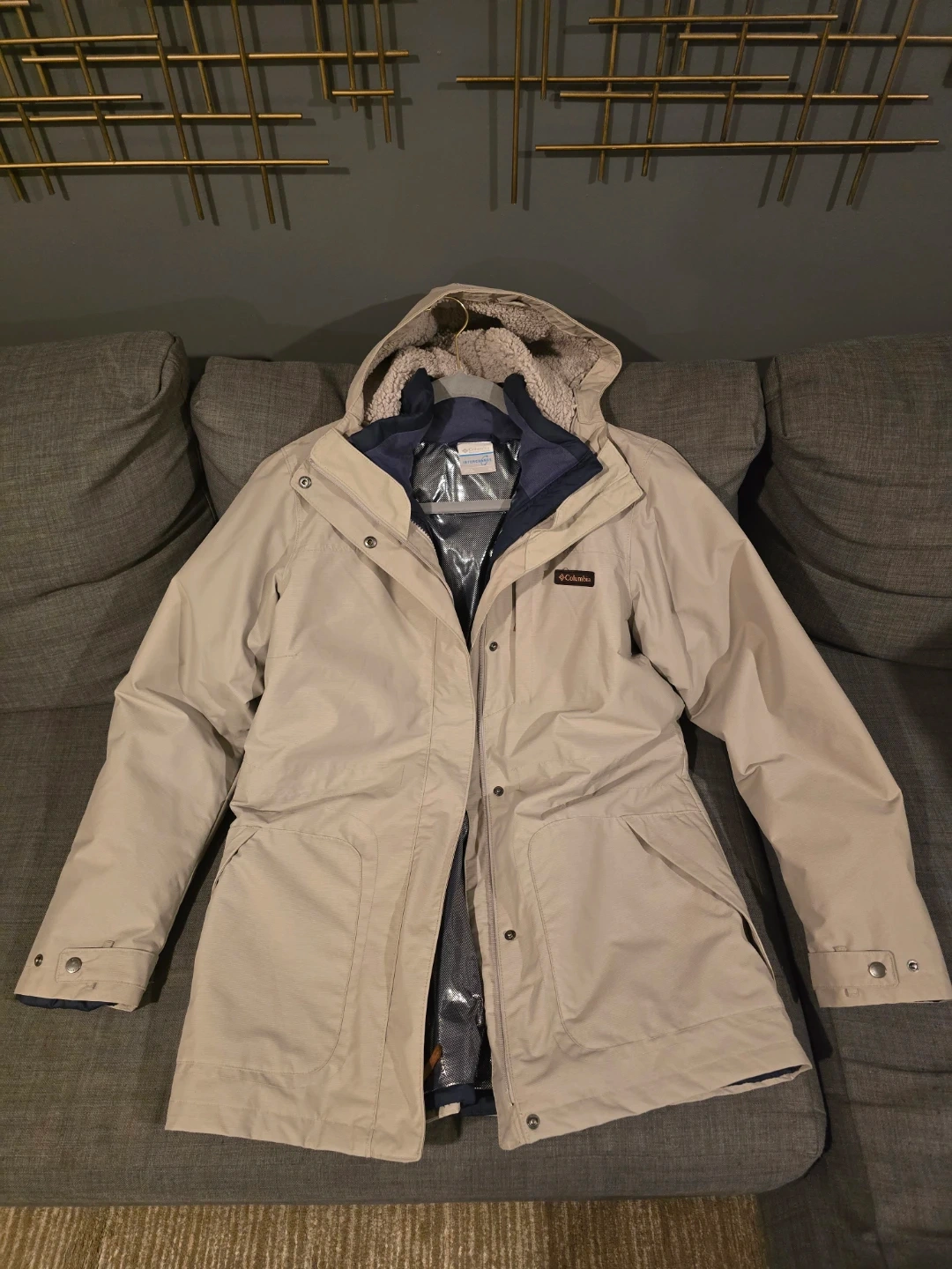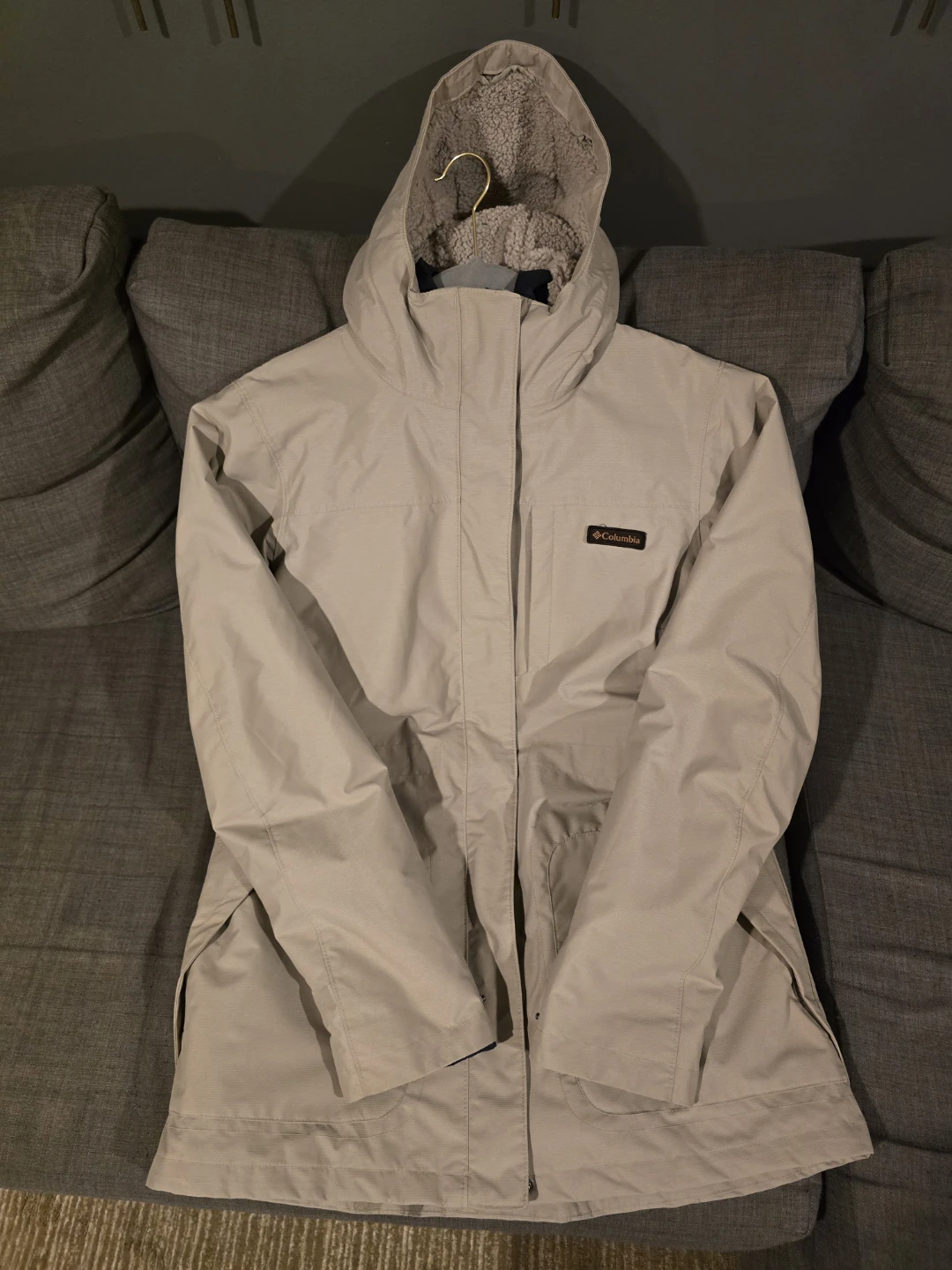 Columbia Jacket Womens Small Cream Interchange Omni Heat Puff Liner 3 In 1 in a beige color. It features a hood and a warm lining, perfect for cold weather. The jacket is in good condition and ready for a new owner!