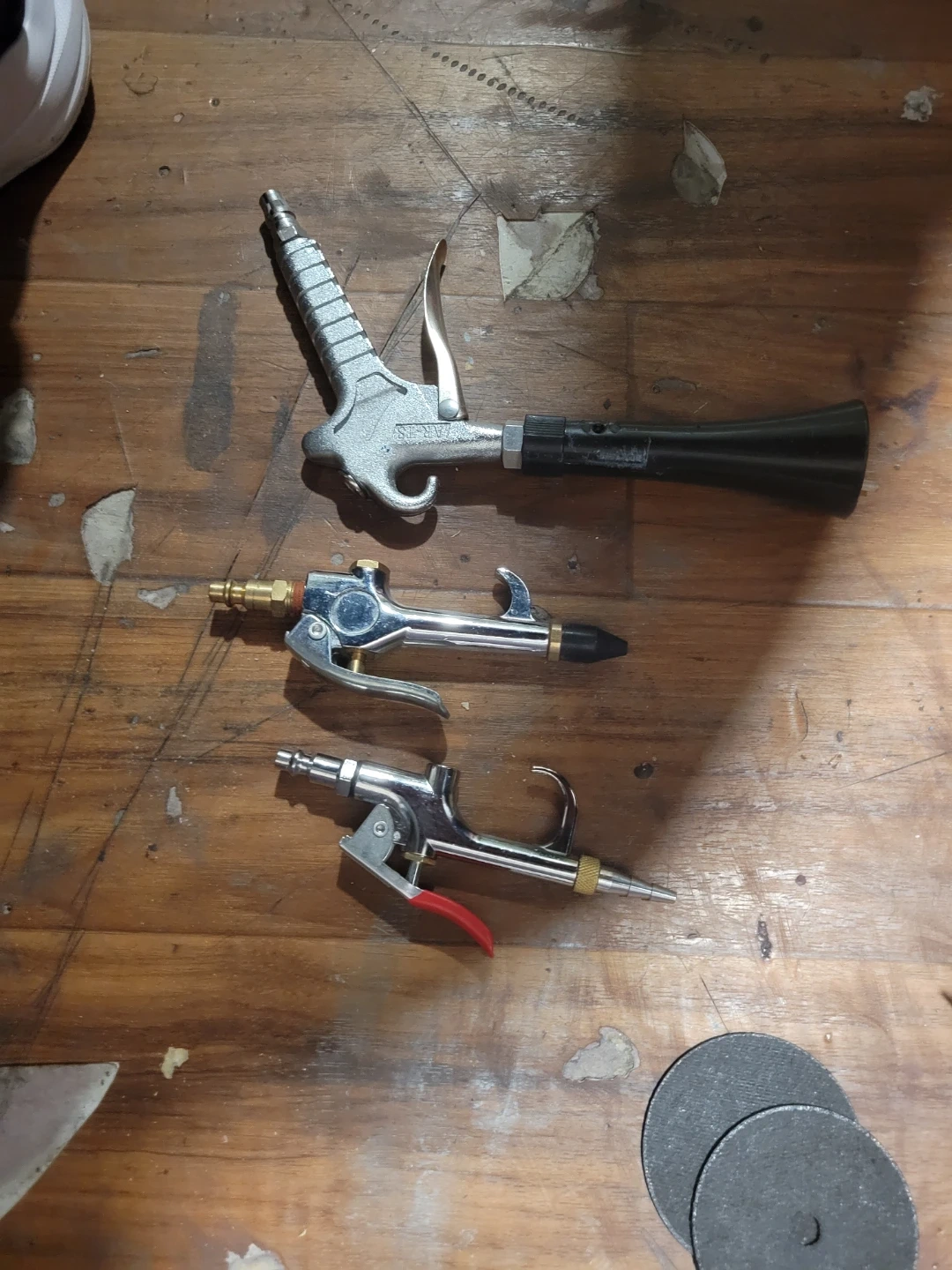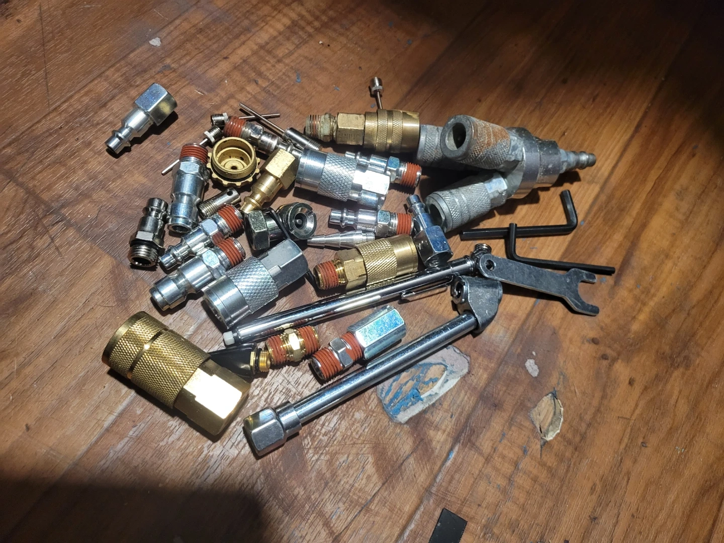 The dewalt airconpresso rBrand new ran 5 times top mini air grinder plus 2 extra discs (brand new) mini air saw plus extra guard and a blade (brand new)2 different size paint sprayers (slightly used) a sand blaster (new) 3 different air blowers (2 brand new other is new)a 50 ft. Air hose (branf new) and every adapter size split valves extra etc. Parts for hook up (brand new).