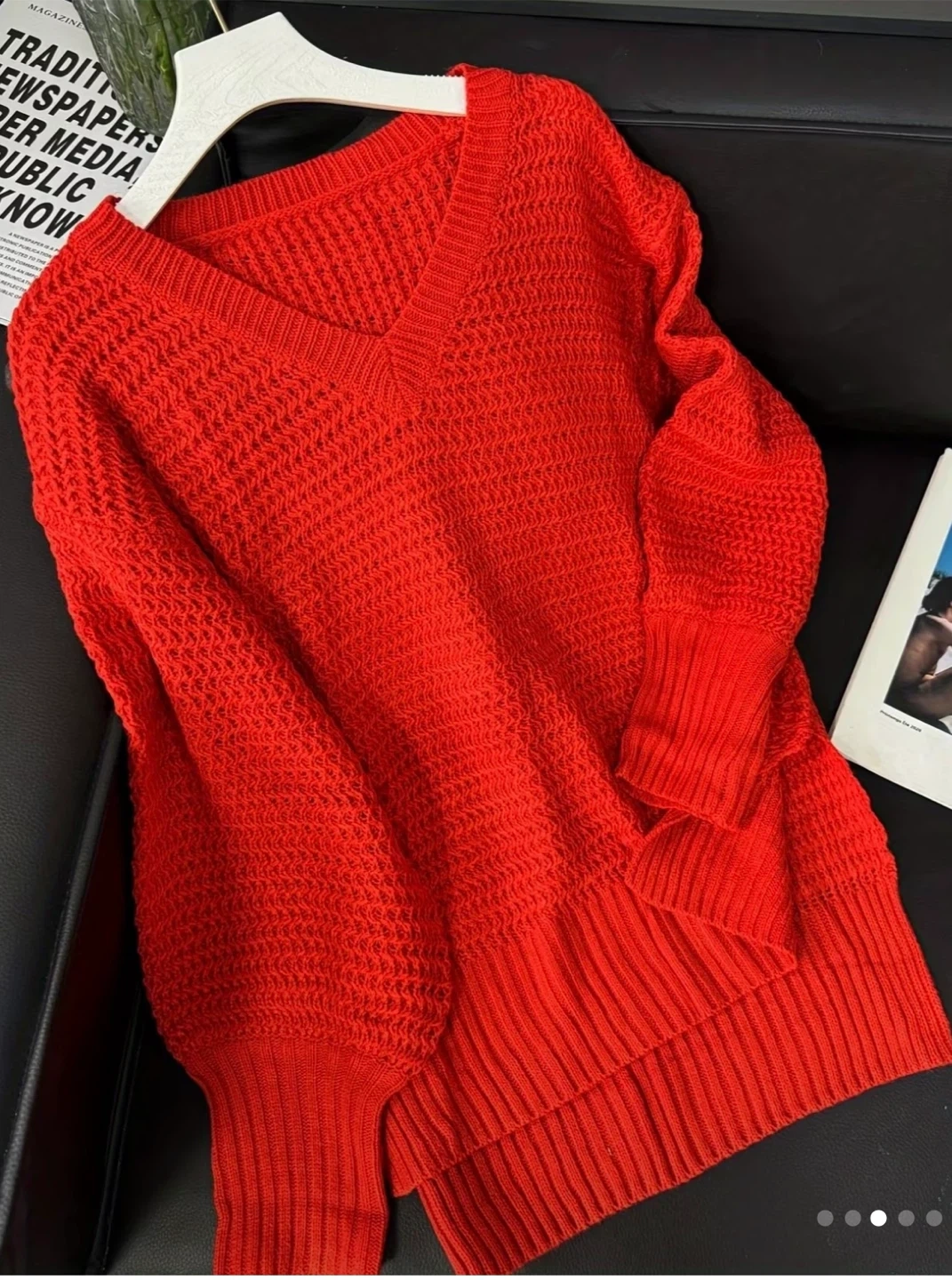 Selling a cozy red knit sweater with a V-neck! It's in great condition and perfect for layering on those cooler days. The knit texture adds a nice touch, and the colour is a vibrant red