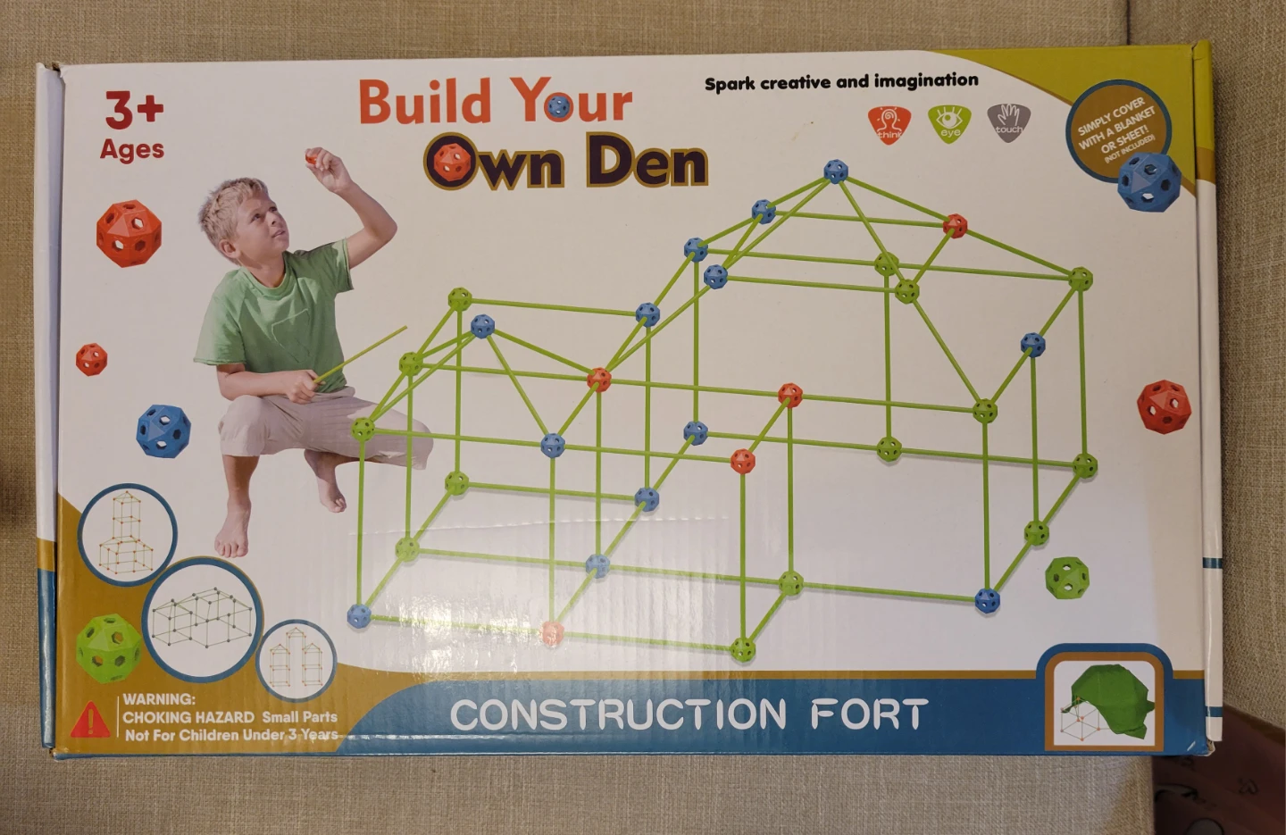 Selling a Build Your Own Den Construction Fort! It's designed for ages 3 and up and encourages creative and imaginative play. Please note that a blanket or sheet is not included for covering the fort
