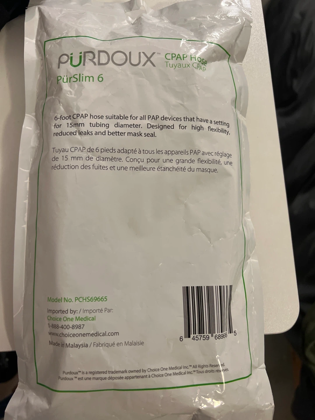 I'm selling a brand new PürdouX PürSlim 6 CPAP hose! It's a 6-foot CPAP hose suitable for all PAP devices with a 15mm tubing diameter. It's designed for high flexibility, reduced leaks, and a better mask seal. The size is 6' (1.83m) and the diameter is 15mm