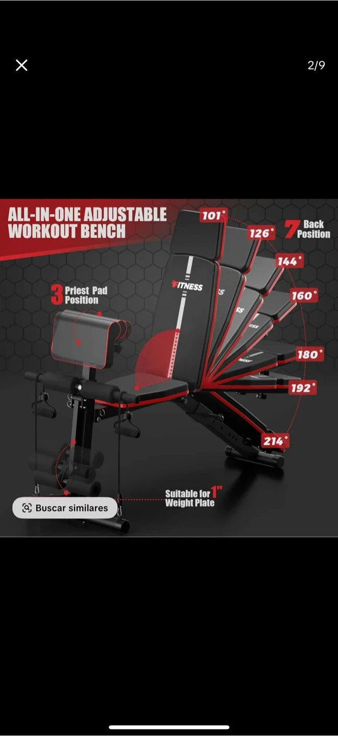 Selling a FITNESS adjustable workout bench. It's an all-in-one design that offers multiple workout positions. The bench is black with red accents. It also can be folded for space saving.