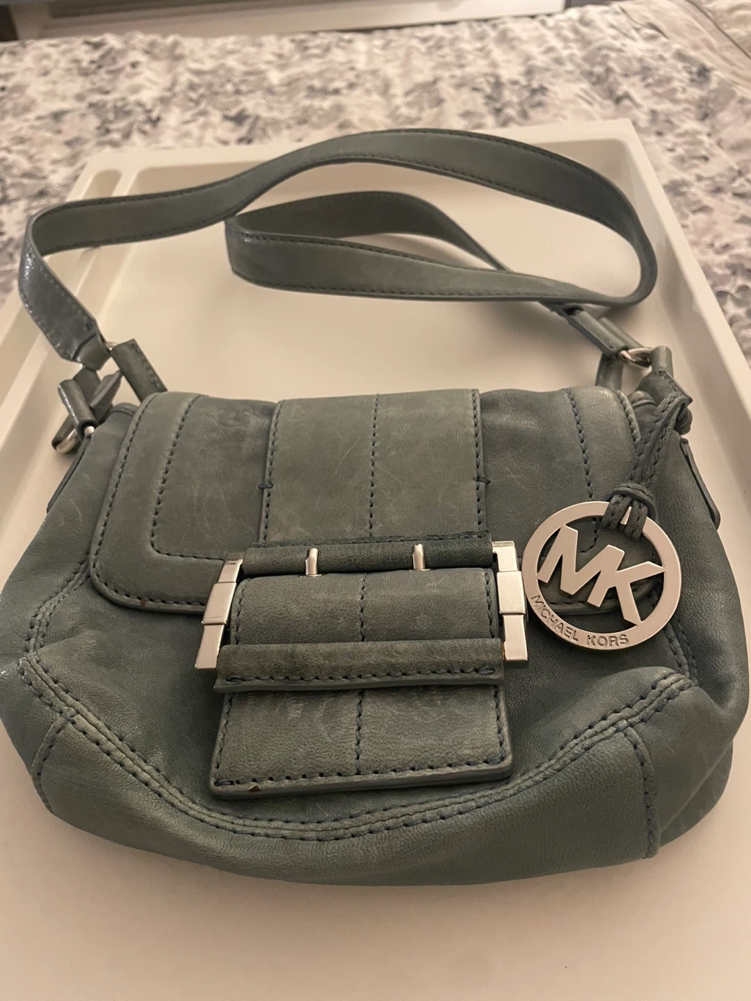 This is a stylish new leather Michael Kors crossbody bag in a lovely bluish grey colour. It's new so no scuffs or scratches, but no tags are affixed.