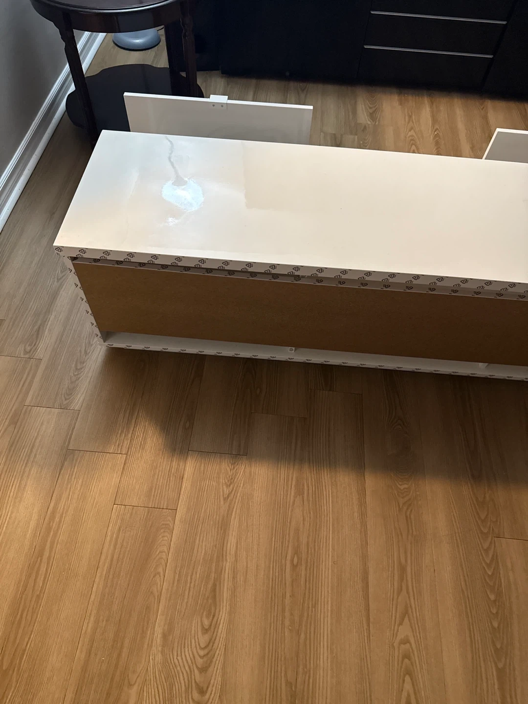 Selling a white TV stand or media console. It features drawers and shelves for storage. Great for organizing your entertainment area!