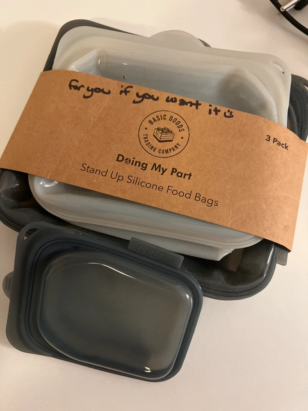 Selling a 3-pack of Basic Goods Trading Company stand up silicone food bags! They're dishwasher safe and perfect for doing your part to reduce waste