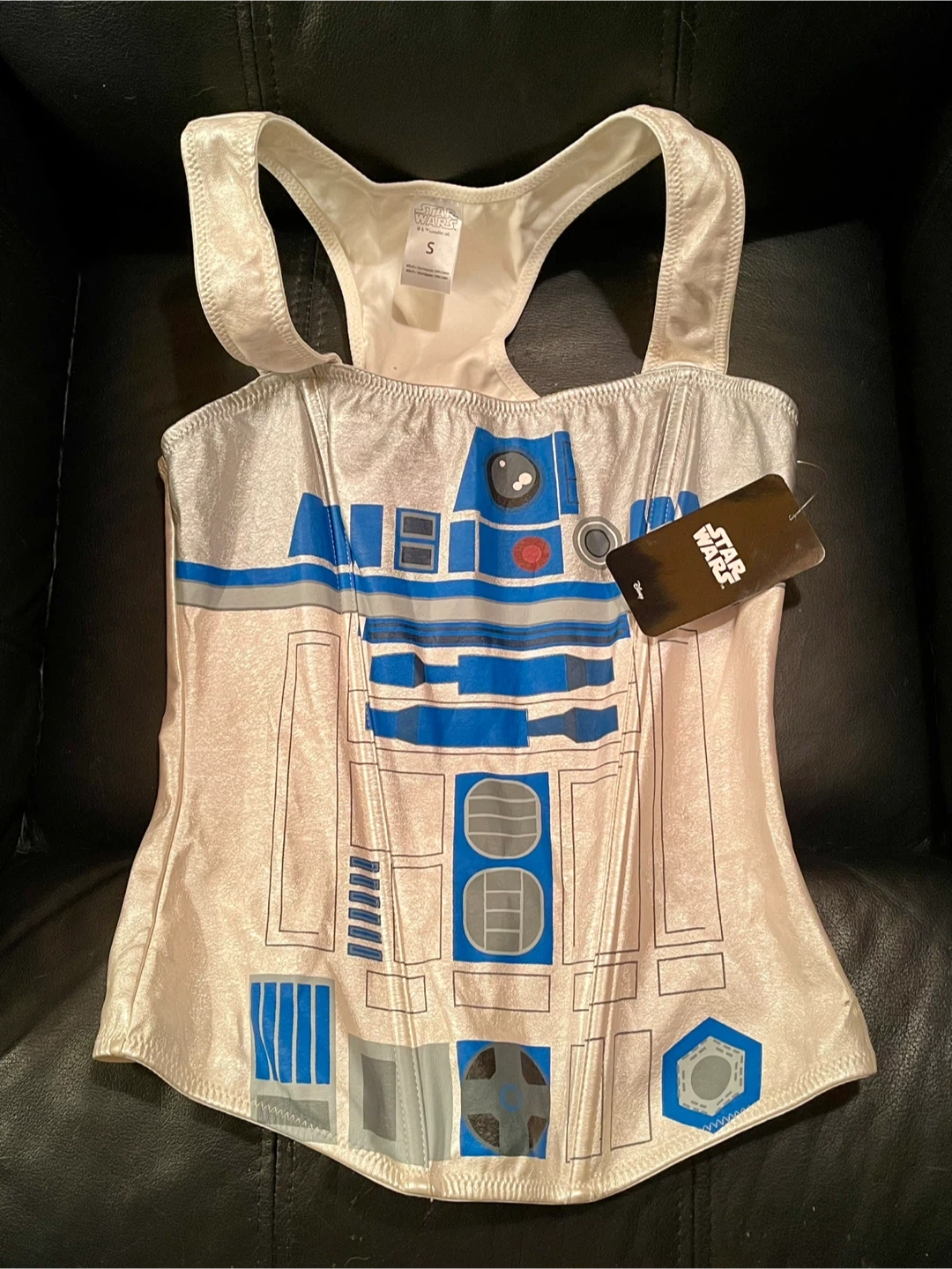 Selling a new with tag Star Wars R2-D2 corset top. It's a size small. The material is 40% PU, 30% polyester, and 30% cotton. Please note there are some imperfections on the back and lower front corner as shown.