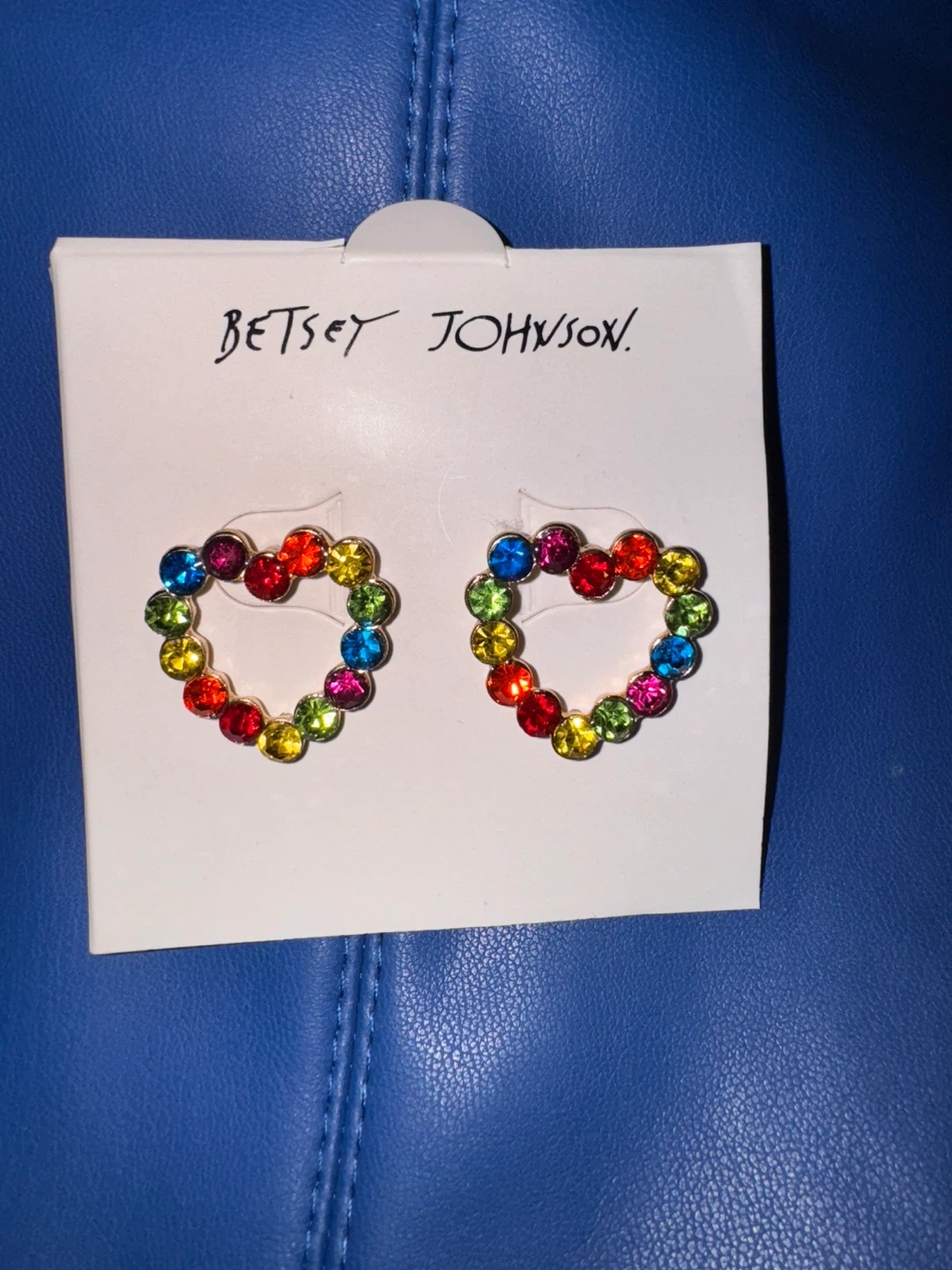 Selling a pair of Betsey Johnson heart stud earrings. These earrings feature a colorful rainbow design. They are in excellent condition and ready to add a pop of color to your outfit!