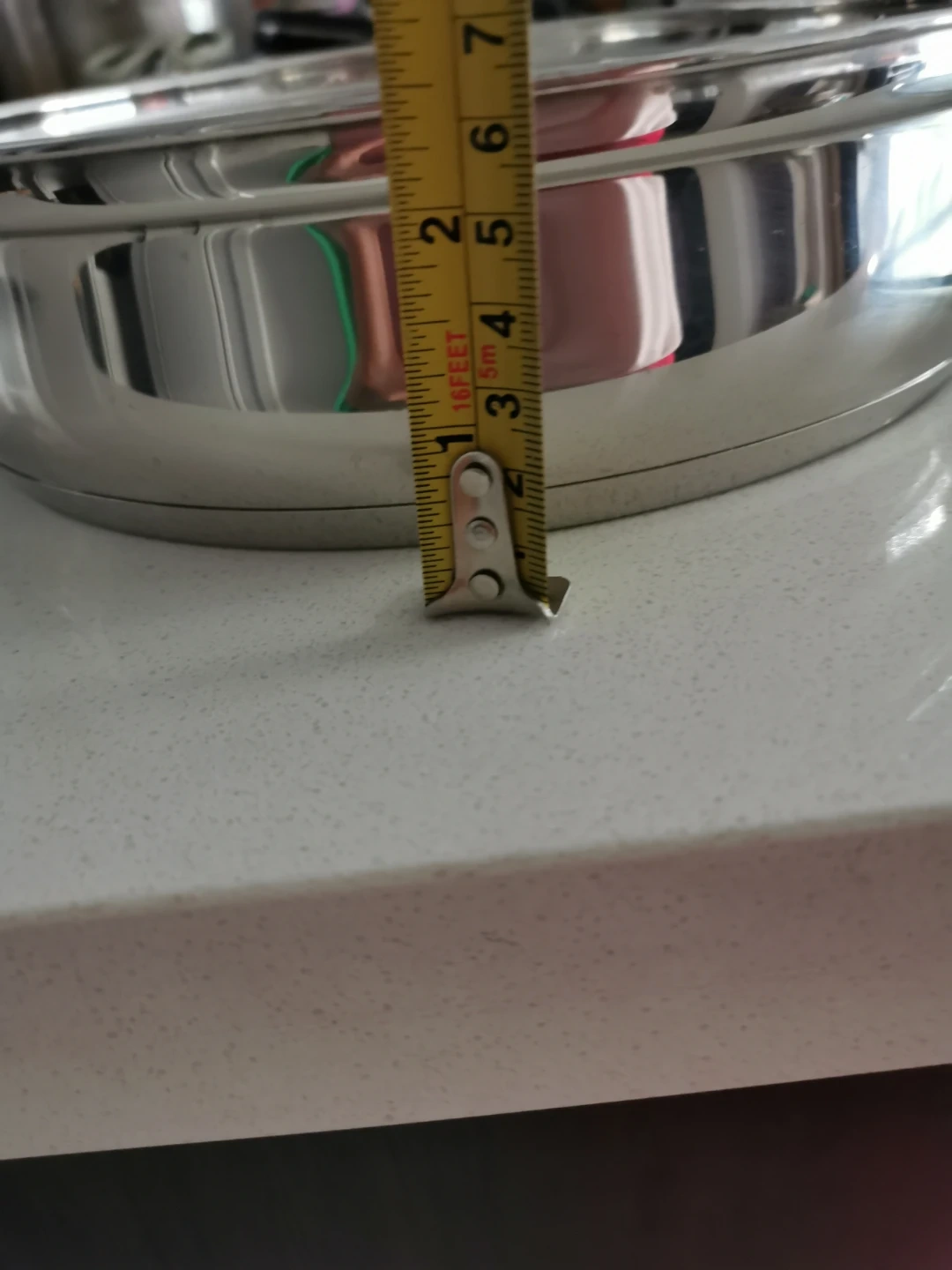 Selling a stainless steel frying pan that comes with a lid. It appears to be in good condition and measures approximately 10 inches in diameter and 2.5 inches in height.
