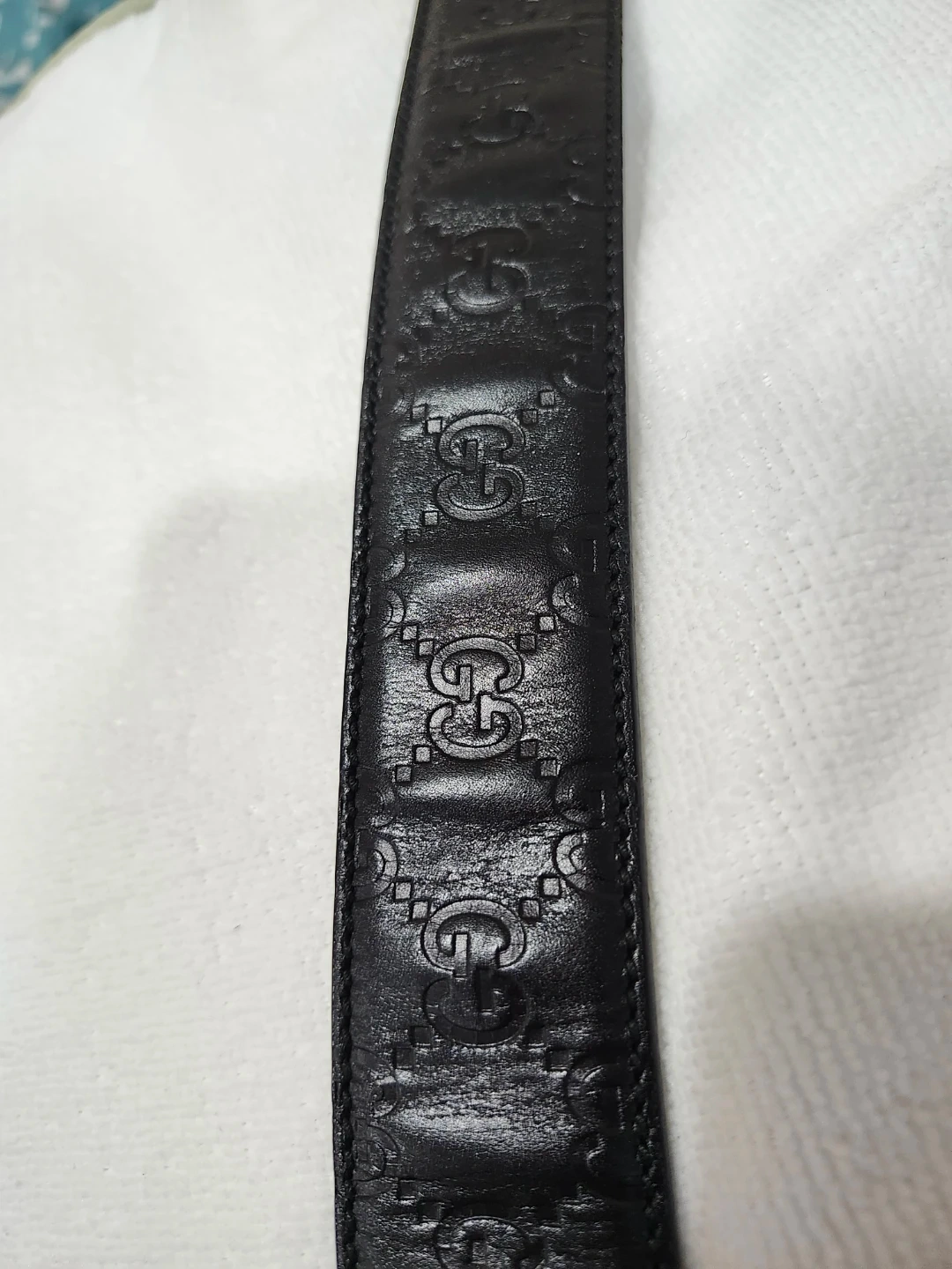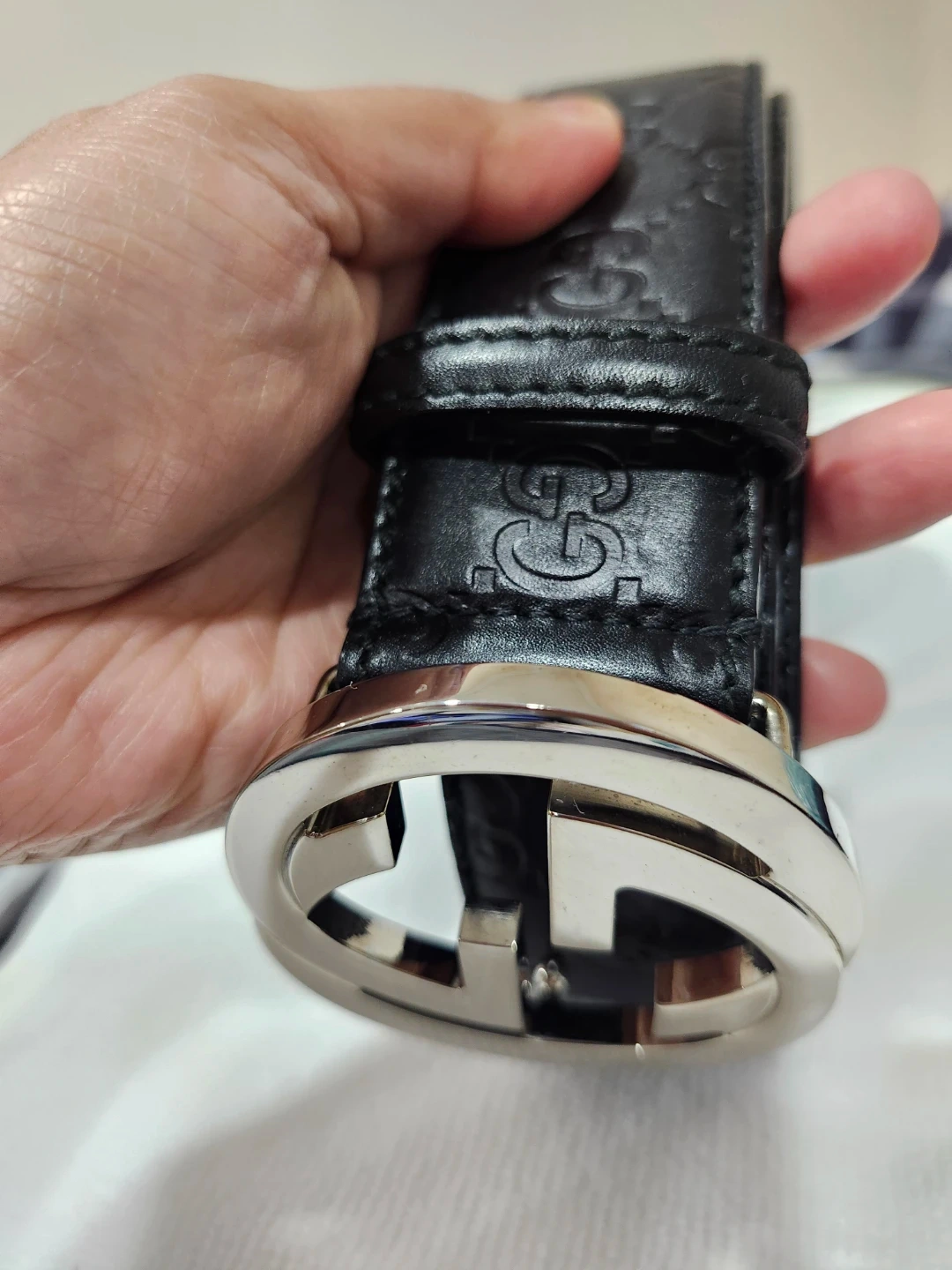 This is a classic Gucci belt in black leather. It features the iconic GG logo buckle and subtle GG pattern embossed on the leather strap. The belt is in great condition and ready to add a touch of luxury to your wardrobe!