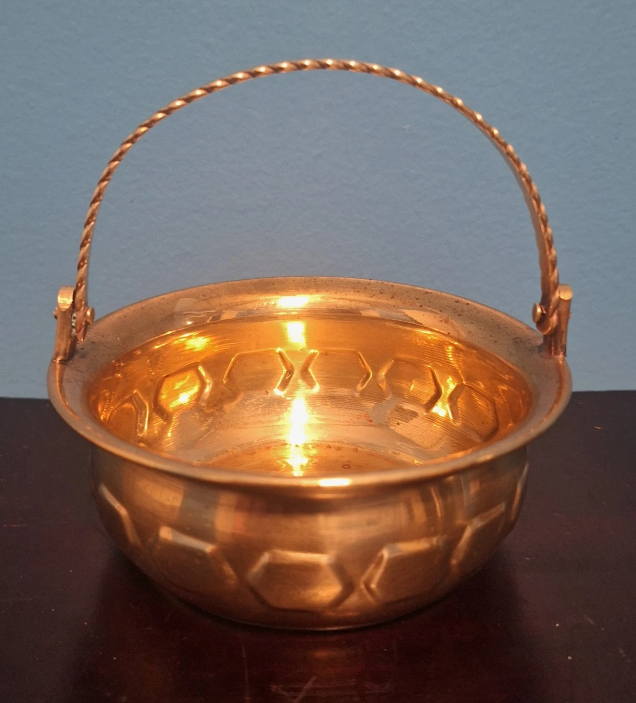 79Lovely brass decorative basket, bowl. It has a unique handle and a charming design around the bowl's exterior. 4x4inches tall with handle up.