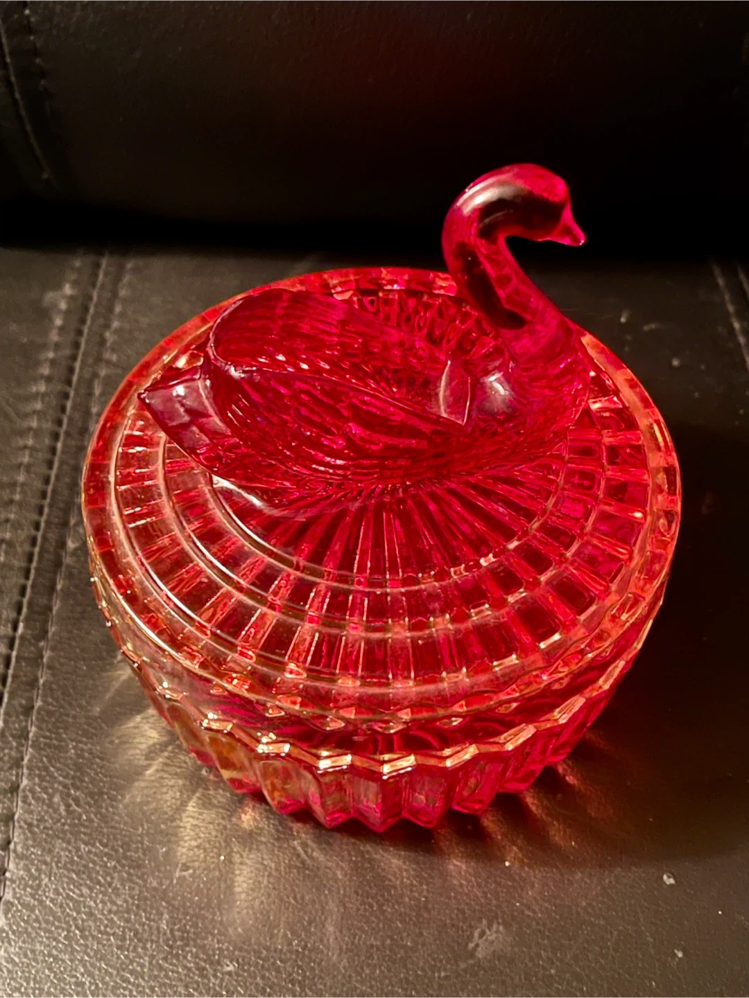 Selling a beautiful vintage red glass trinket dish believed to be from the 1930s or 40s. It features a lovely swan design on the lid. Perfect for powder, candy, jewellery or other small items or as a decorative piece. The lid features a lipstick holder built into the back of the swan. Very good condition except for a few tiny flea chips along the serrated upper edge of the bowl.