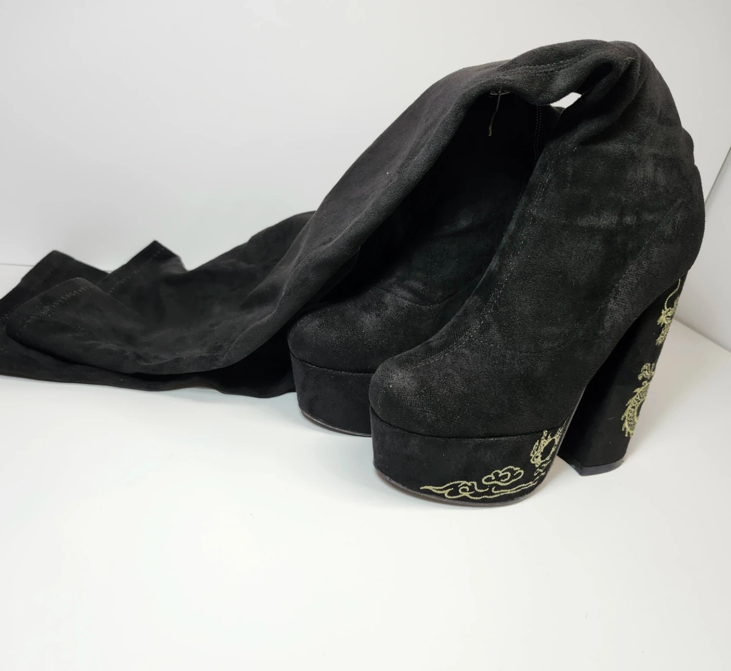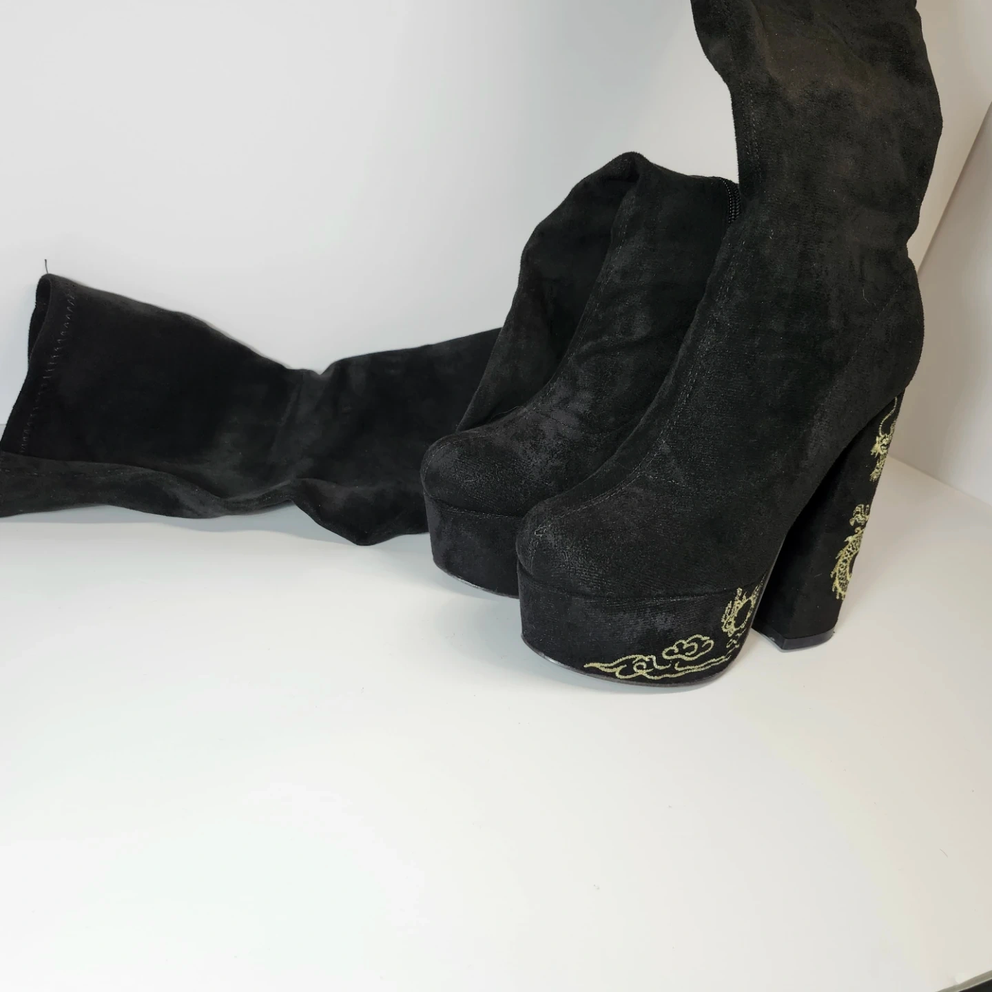 Selling a pair of stylish black thigh-high platform boots in size 7. They feature a chunky heel and a unique design on the heel. These boots are in good condition and ready for a new home!