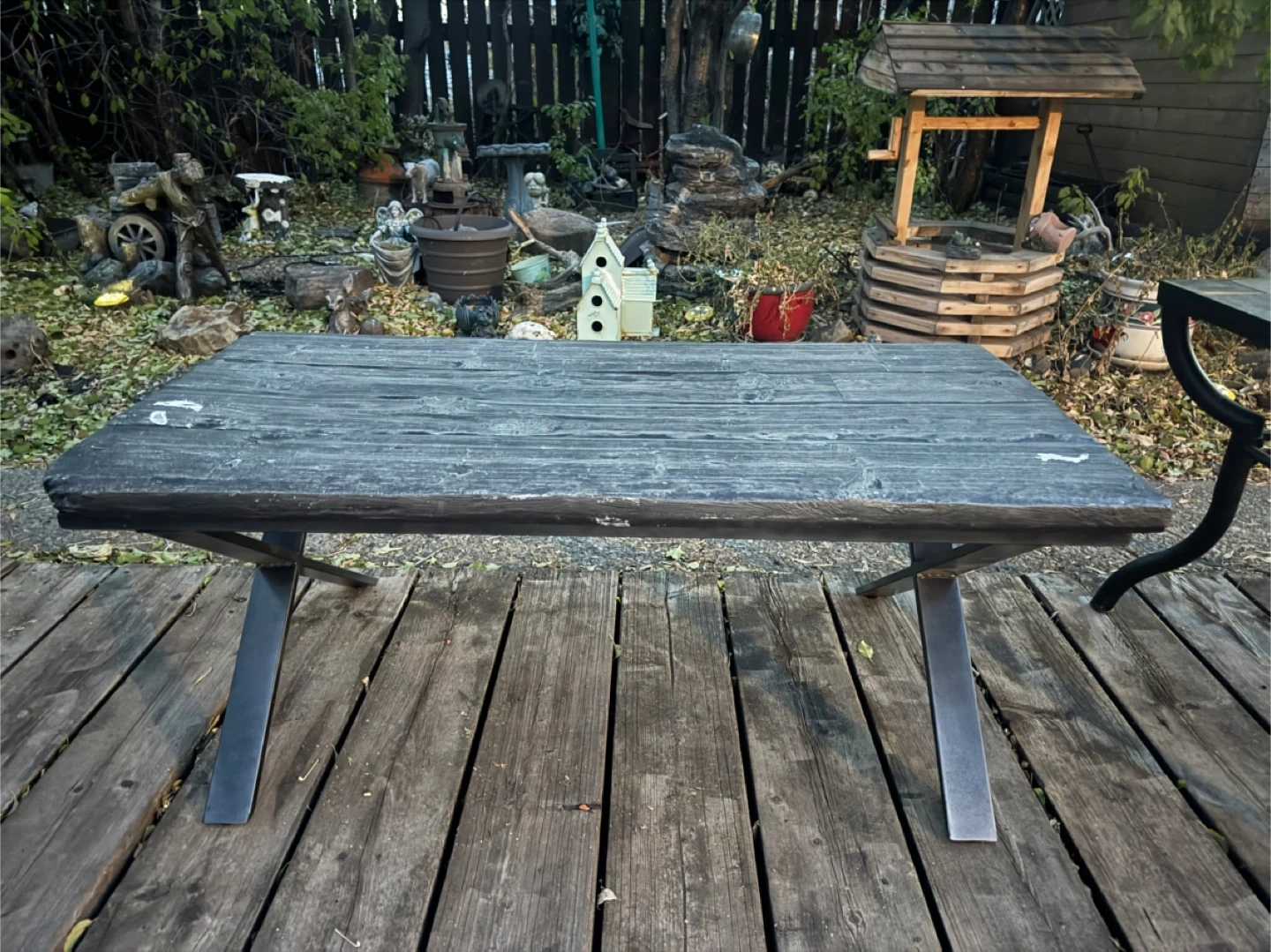 Selling a rustic grey wooden coffee table, perfect for adding a touch of character to your living space! The table measures approximately 47 inches in length and 23 inches in width. It shows some signs of wear, but it only adds to its unique charm