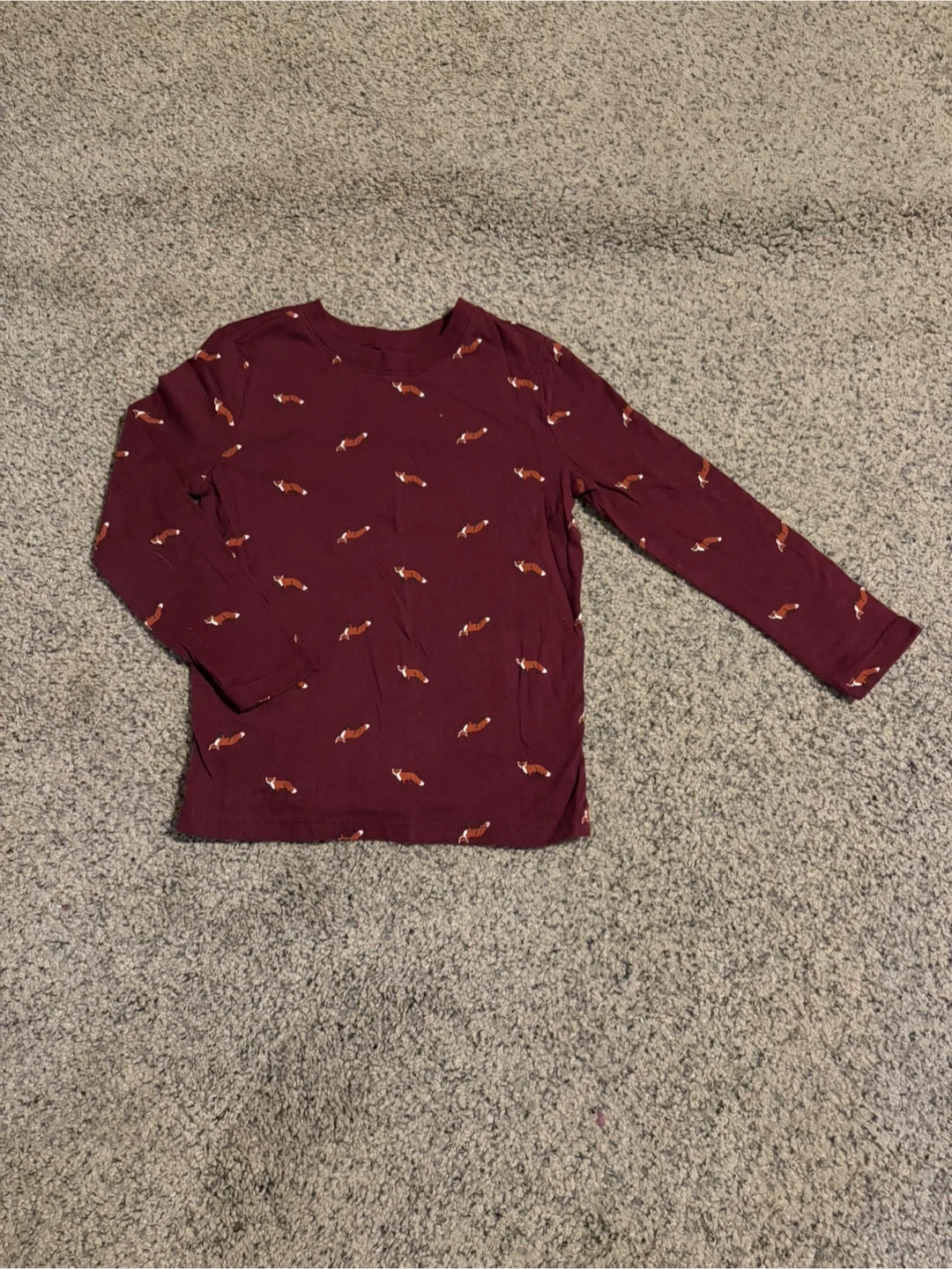 burgundy long-sleeve shirt from Old Navy, perfect for your little one! It features an adorable fox print all over and is in great condition. Size is 5T.