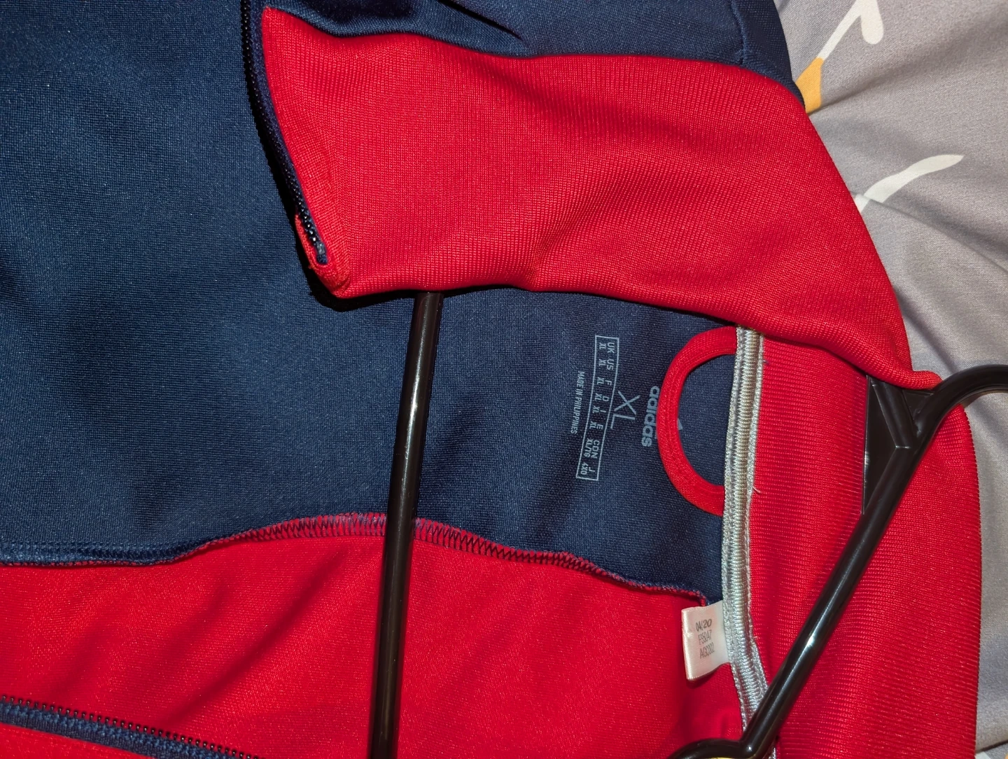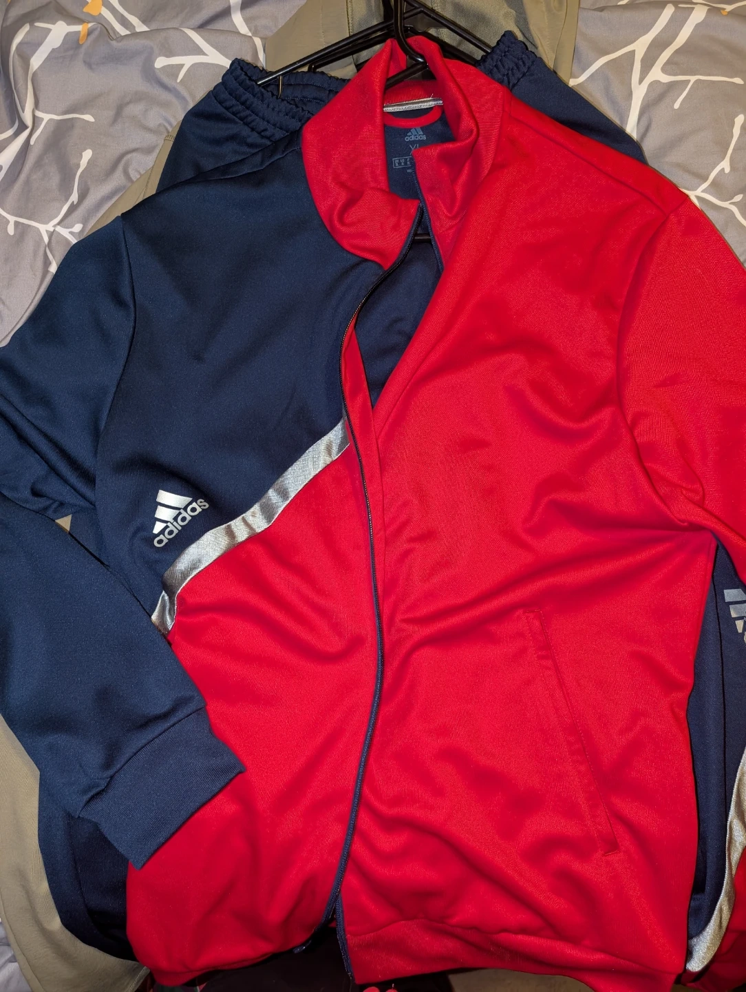 Adidas tracksuit with an XL jacket and medium pants. The jacket is red and navy, while the pants are navy with red and silver accents. A comfy and stylish set!