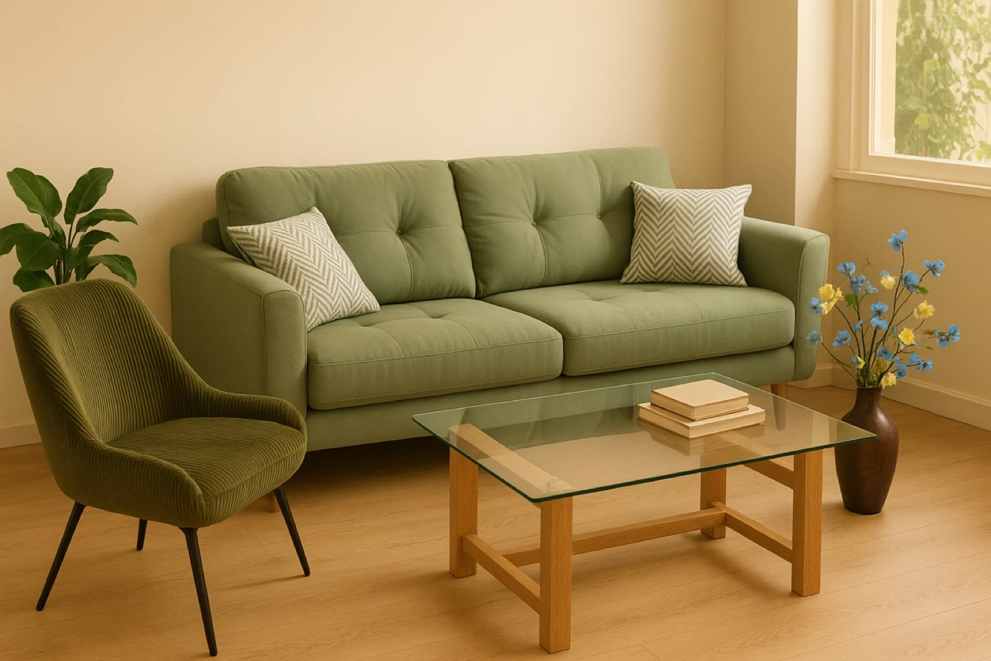 Selling a lovely green sofa and chair set, perfect for adding a touch of nature to your living room! Also included is a stylish glass coffee table to complete the look. This set is in great condition and ready for a new home. It’s a comfy and chic addition to any space!