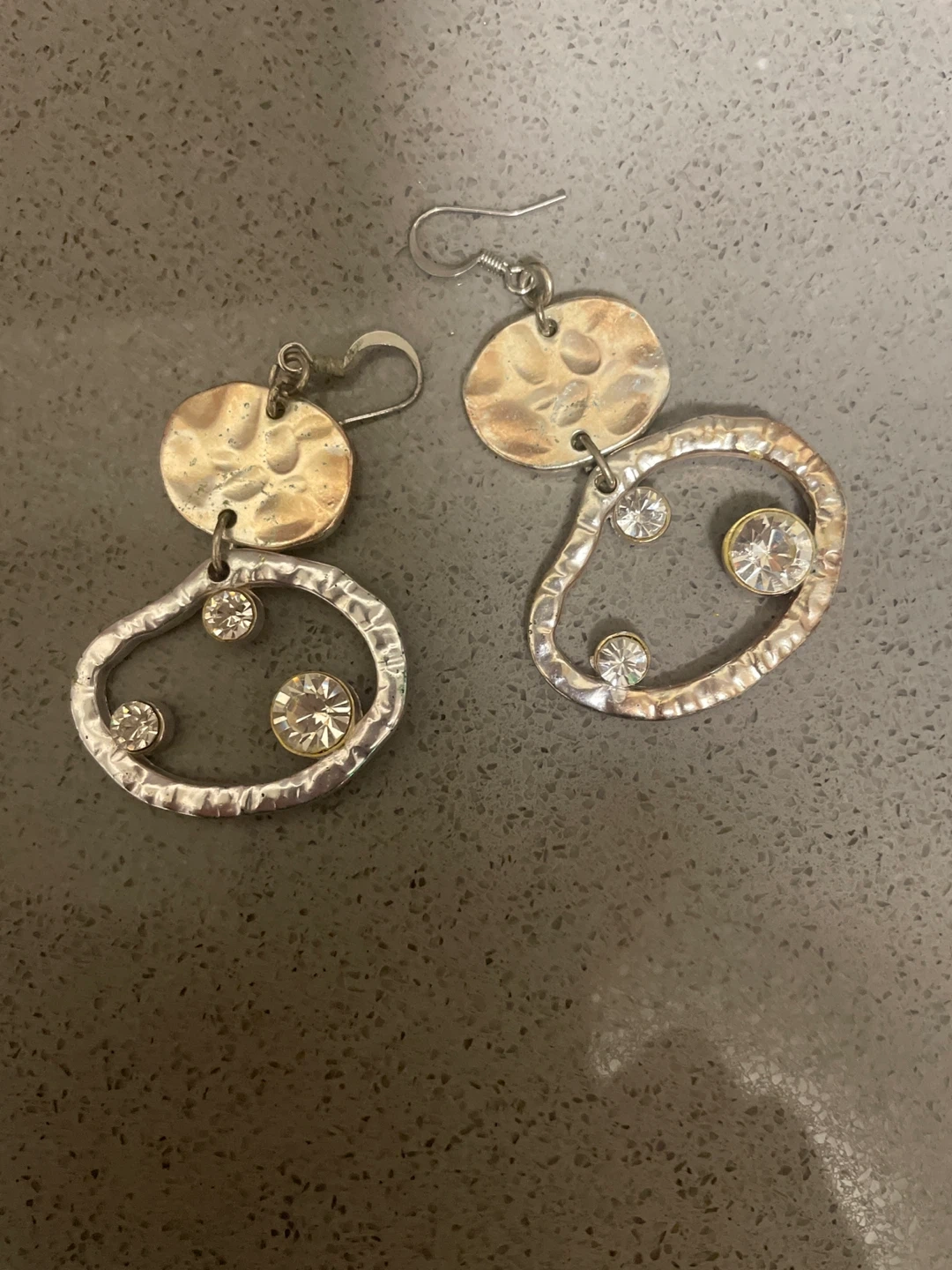 These are a pair of dangle earrings. They feature a silver and gold colour scheme with rhinestones. They are in good condition!