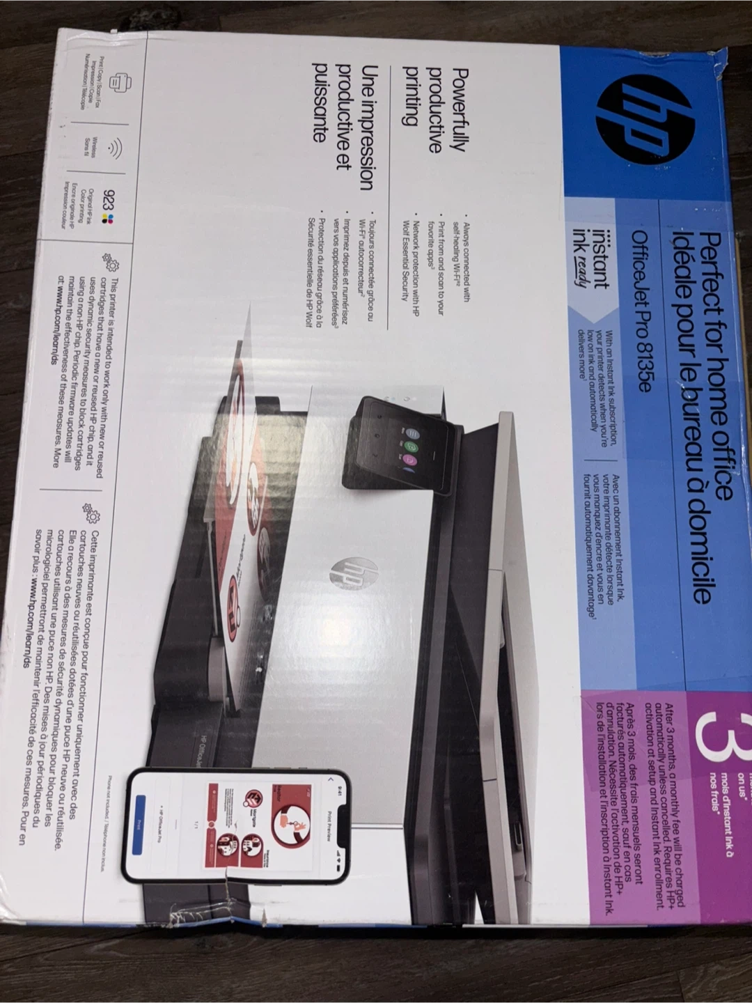 Selling an HP OfficeJet Pro 8135e printer, ideal for home office use! It offers productive printing and comes with 3 months of instant ink included. The printer is in great condition and includes its original box.