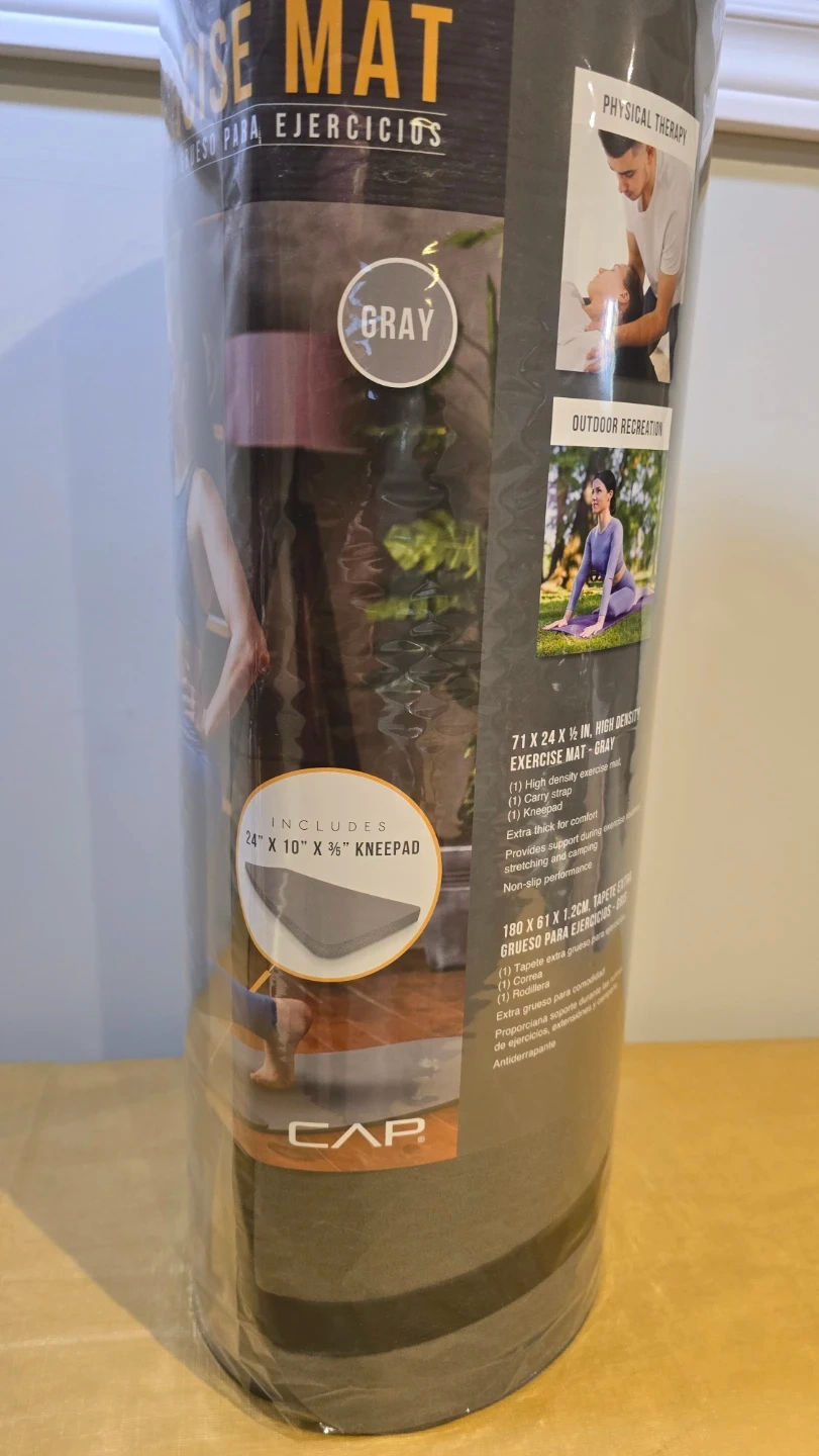This CAP exercise mat is extra thick for added cushioning and support during exercise! It's gray and measures 71 x 24 x 1/2 inches. It also comes with a 24 x 10 x 5/8 inch kneepad and a carry strap for easy transport