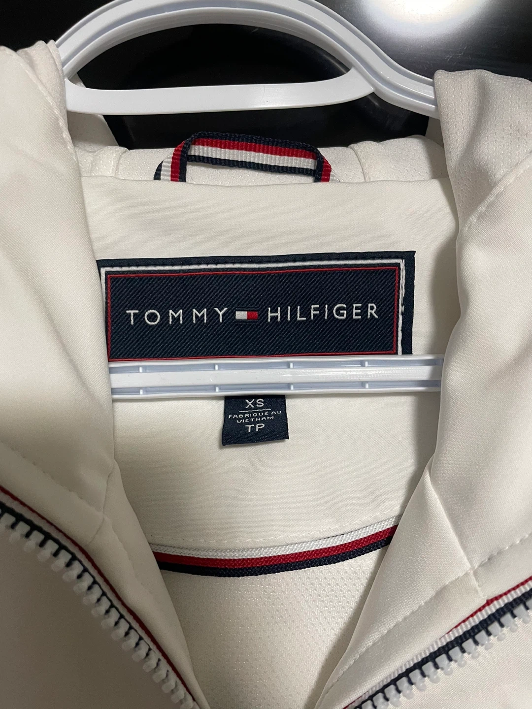 Selling a Tommy Hilfiger white jacket in size XS. It has a few small marks on the sleeve, as shown in the pictures, but otherwise it's in good condition. Perfect for spring!