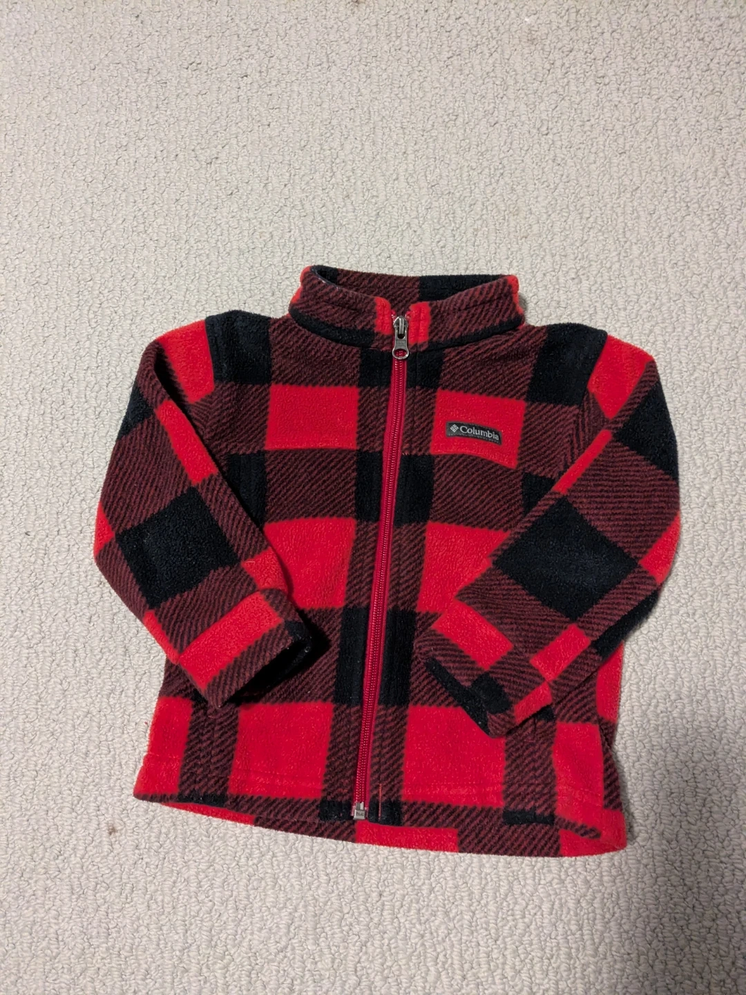 Here's a cozy Columbia fleece jacket in a red and black plaid pattern! It's perfect for keeping your little one warm on chilly days.