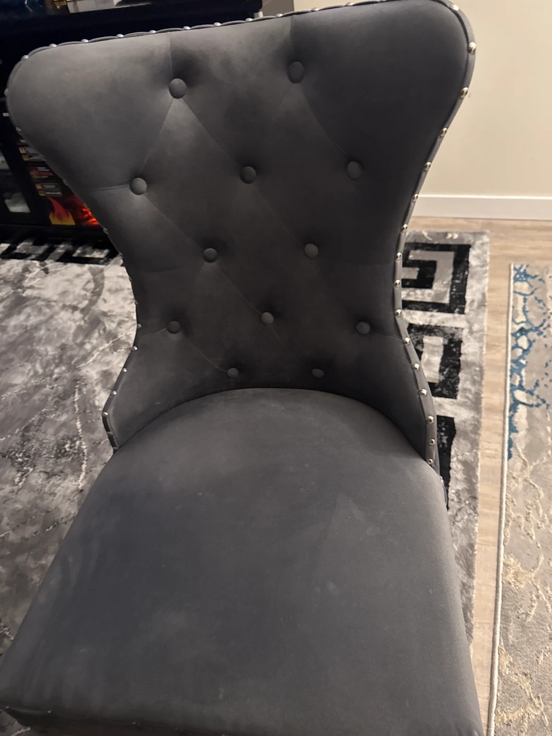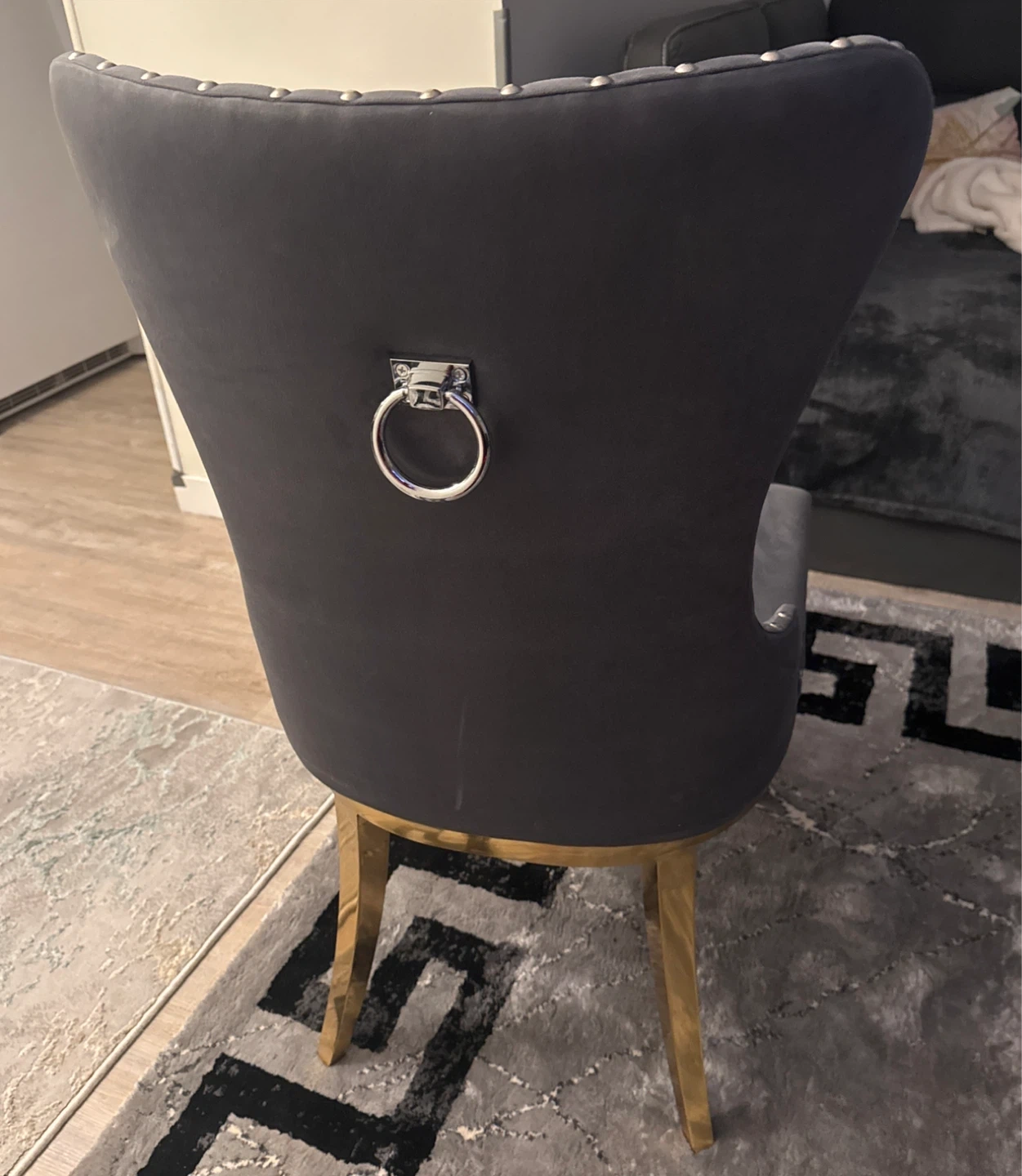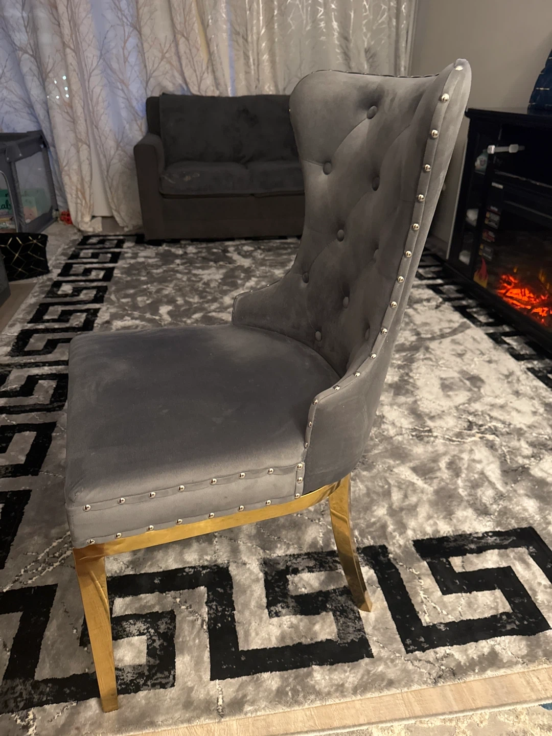10Selling a stylish 4 pair grey velvet dining chair! It features a tufted back and sleek gold legs, adding a touch of elegance to any dining space. The chair is in great condition and ready for a new home