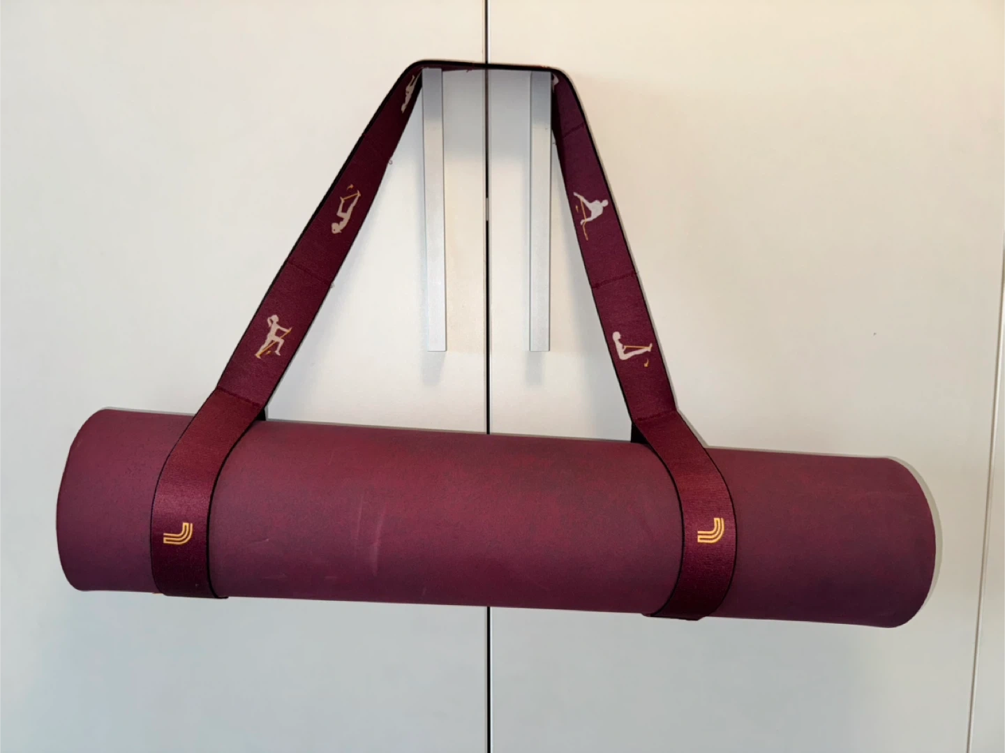 Selling a burgundy yoga mat with a matching strap. It's in great condition and ready for your next yoga session! The strap makes it easy to carry around and you can use it for stretching as well.