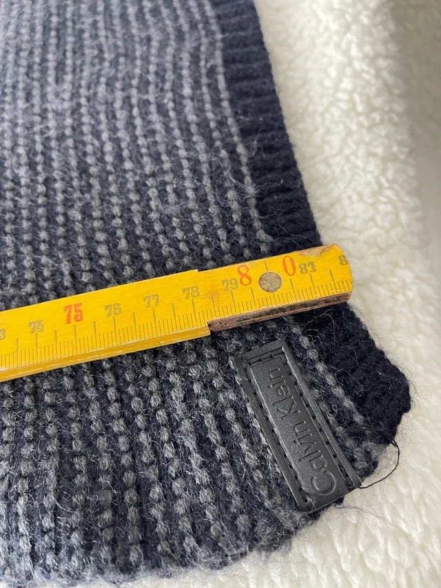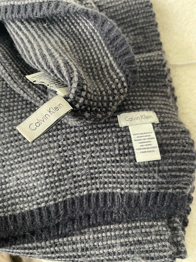 278Stay warm and stylish with this gently used Calvin Klein scarf, crafted from 100% acrylic for a soft and cozy feel, featuring a sophisticated grey and black knit pattern. Specifications: * Brand: Calvin Klein * Material: 100% Acrylic * Colour: Grey, Black * Style: Knit * Size: approximately 80 cm long This pre-owned scarf is in excellent condition and ready to add a touch of elegance to your winter wardrobe.