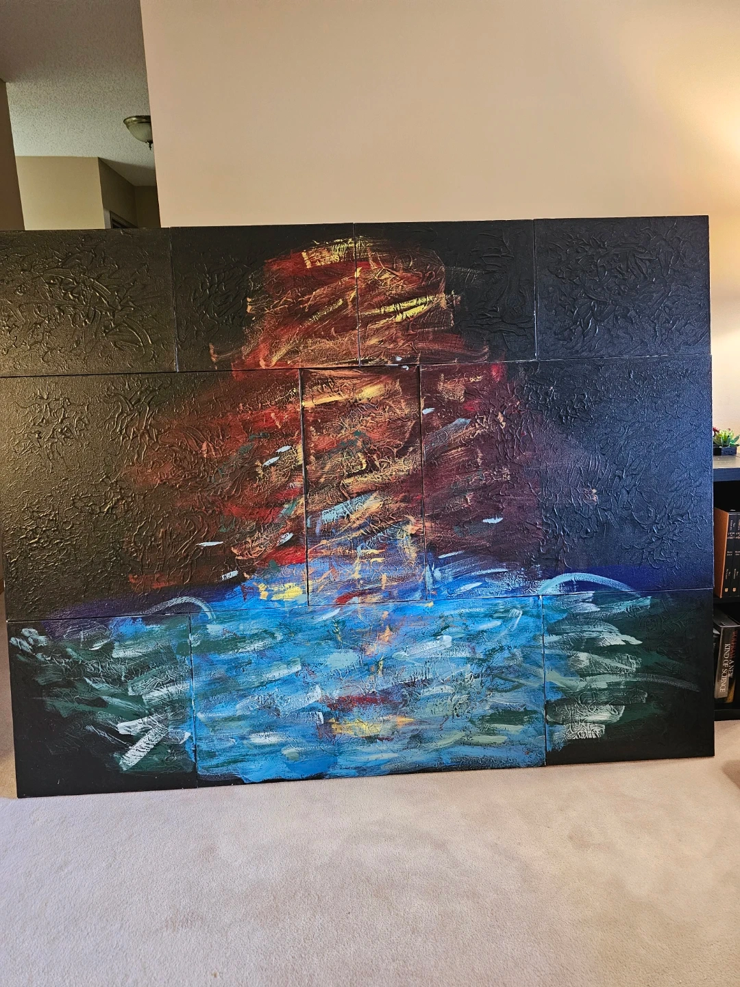 72 x 56" (183 x 142 cm) Acrylic on canvases. There are 10 canvases that bolt together. Bolts not screws, so they are more solid.They can be taken apart with a Philips screwdriver (included if you want) for easier moving.