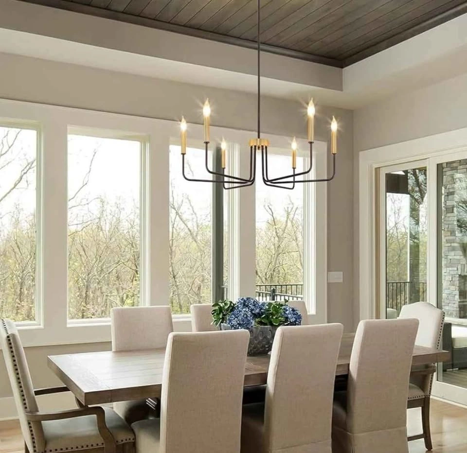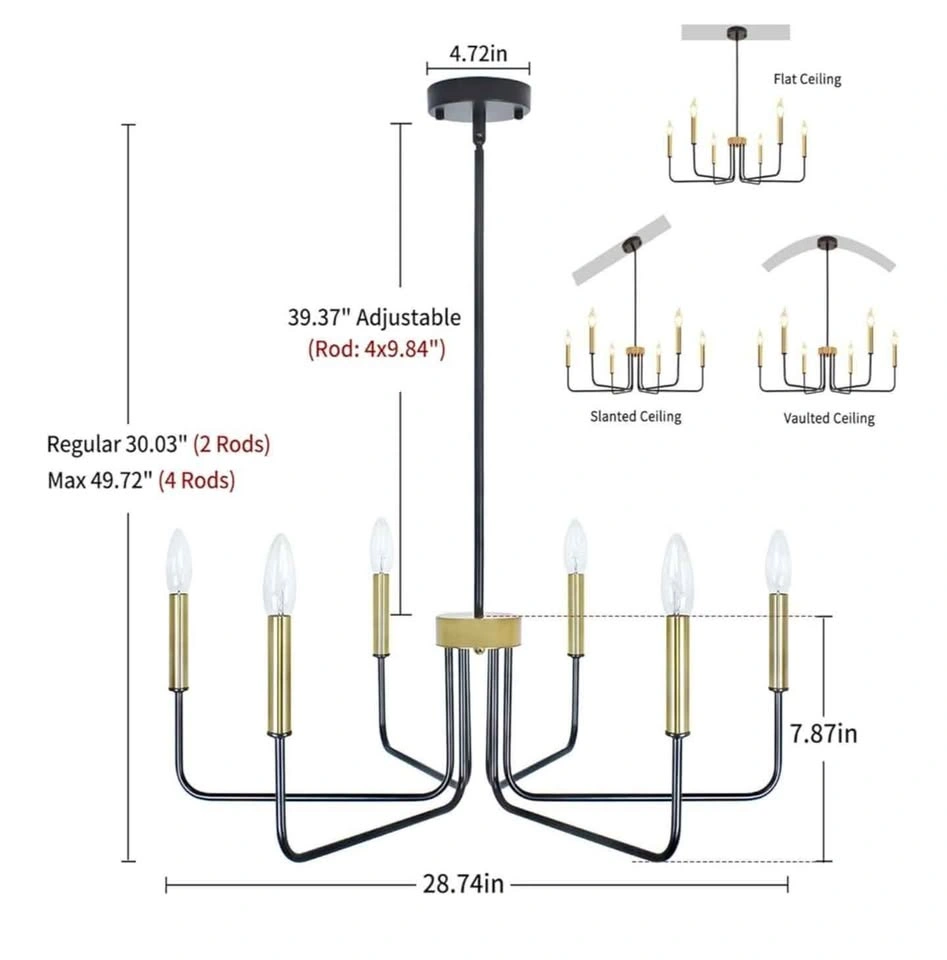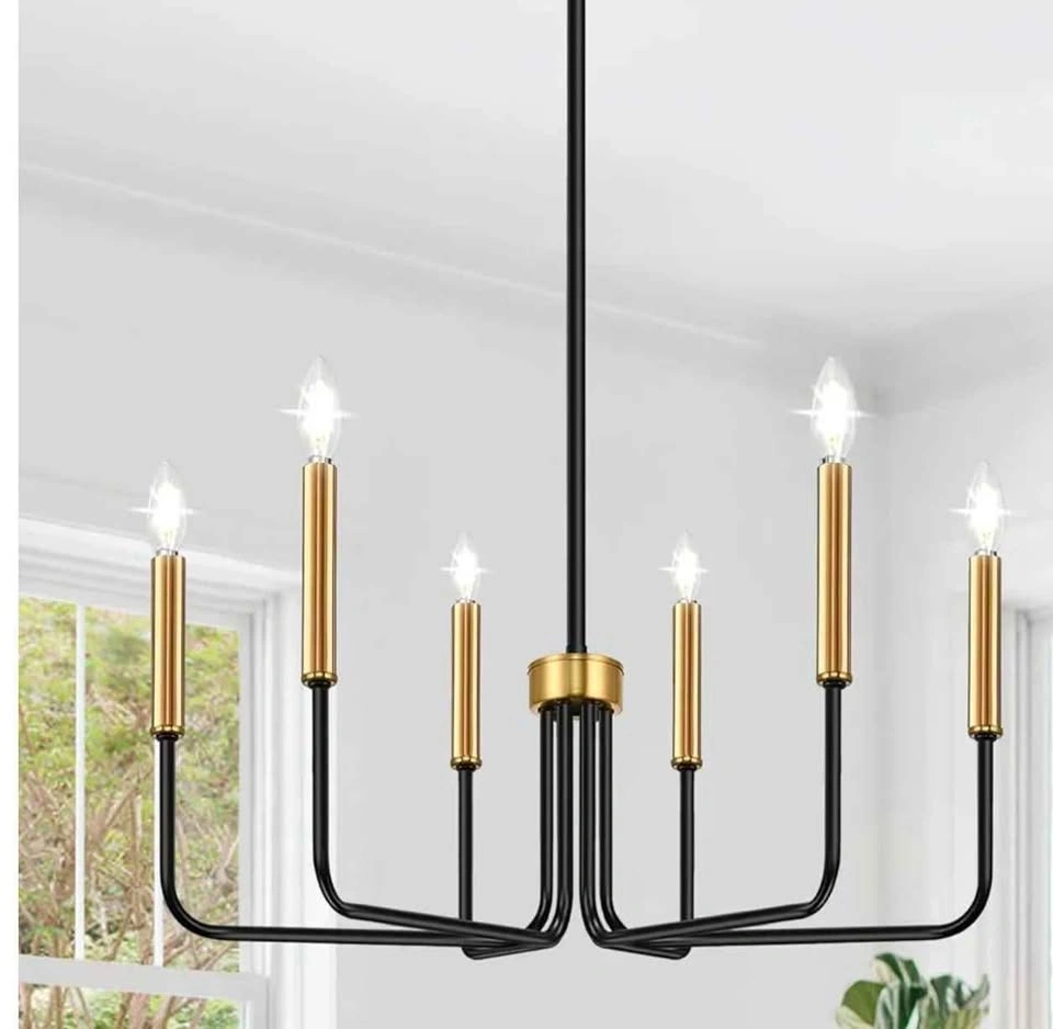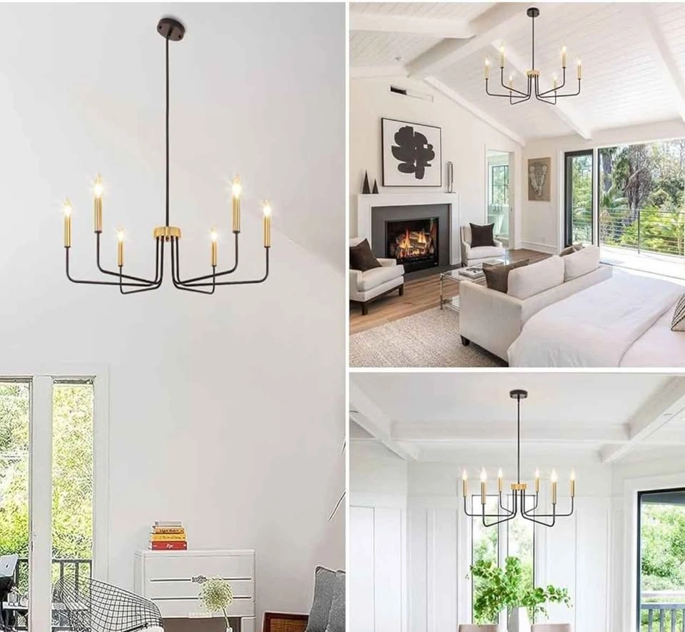 30This black and gold candle-style chandelier blends farmhouse character with shabby chic elegance — the perfect statement piece for a dining room, kitchen, or entryway. Bring soft elegance and vintage charm into your home with this black and gold candle-style chandelier. Perfect for dining rooms, kitchens, or entryways, it blends shabby chic romance with modern farmhouse style. ➛ 6 candle-style lights with E12 base (up to 60W each) ➛ Dimensions: 28.74″ wide × 7.87″ high ➛ Adjustable hanging height up to 49.72″ with splicing rods included ➛ Compatible ceilings: flat, sloped, or vaulted ➛ Condition: brand new, only opened for photos Comparable chandeliers retail for $250–$400+, but this one is priced well below retail — giving you timeless style for less. Available by appointment only. Check out my other ads ✔️