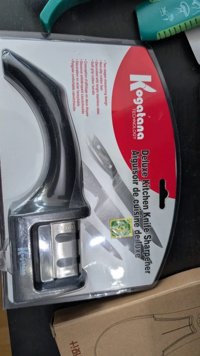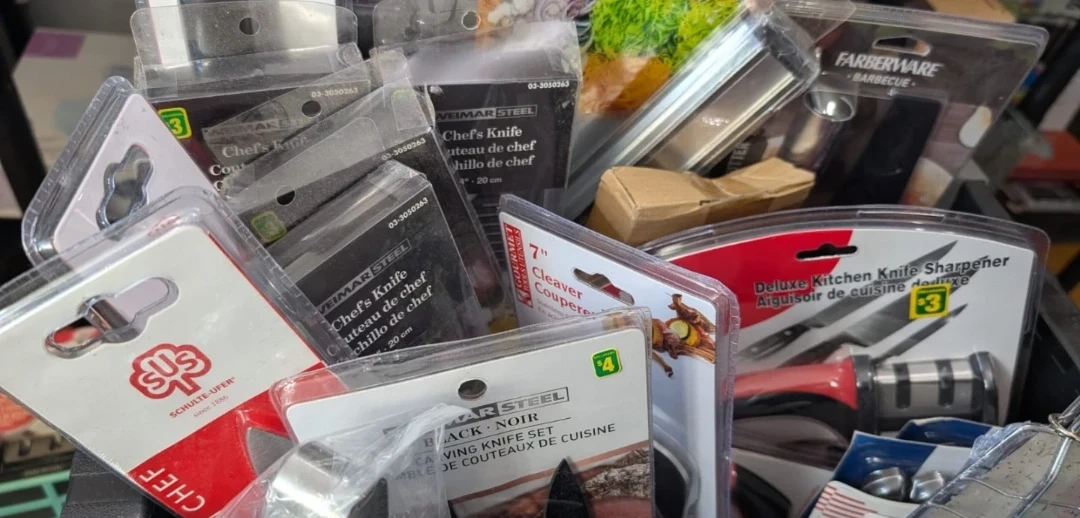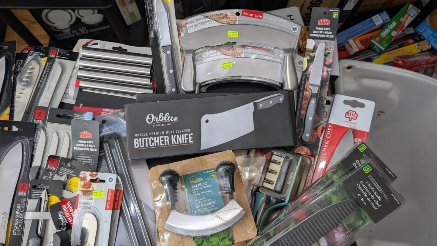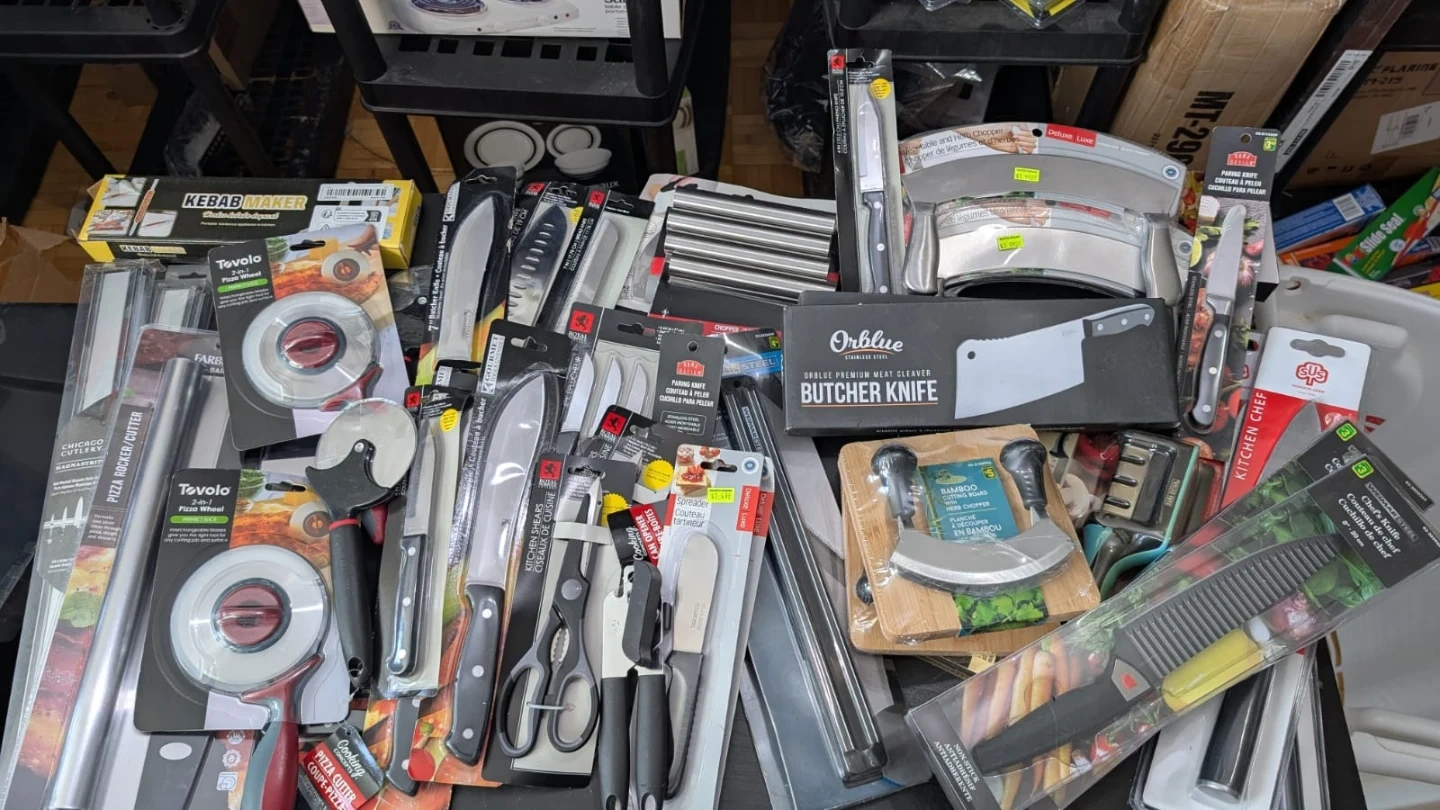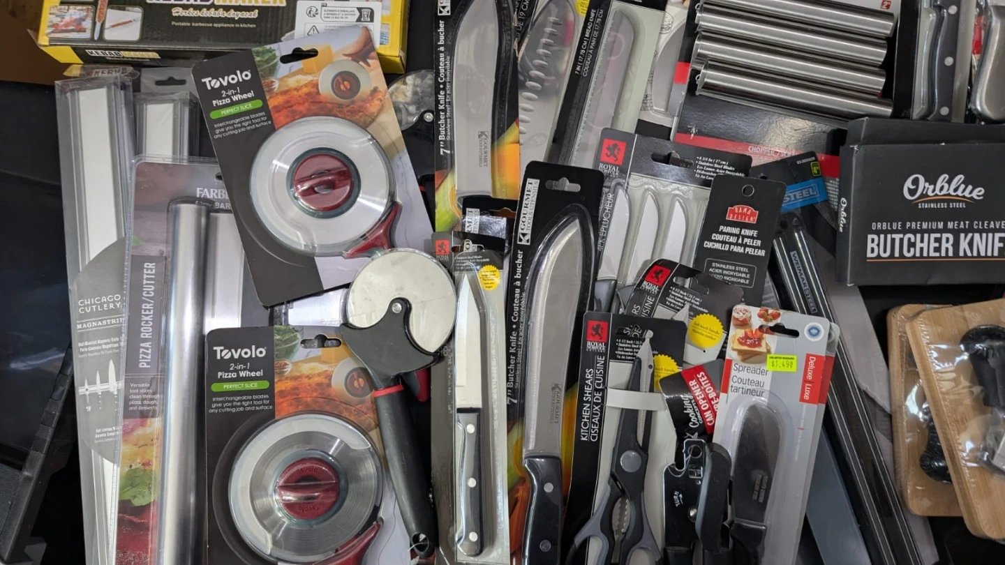 145Everything is brand new. Selling a variety of kitchen knives, cutters, and sharpeners are available. There's an Orblue Premium Meat Cleaver Butcher Knife ($19.99), 2 Tovolo pizza wheels ($23.97 each), 3 Chicago Cutlery 18" Knife Holders ($29.99 each), 6 Knife Sharpeners and more! Great for stocking up your kitchen. Pick up only.