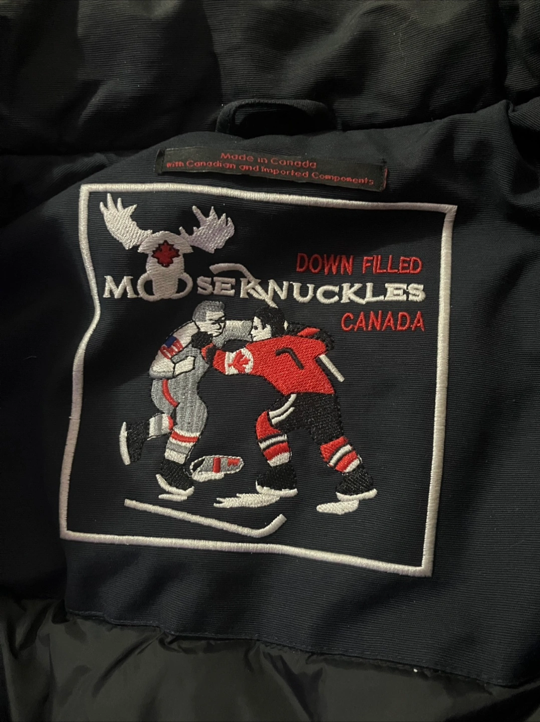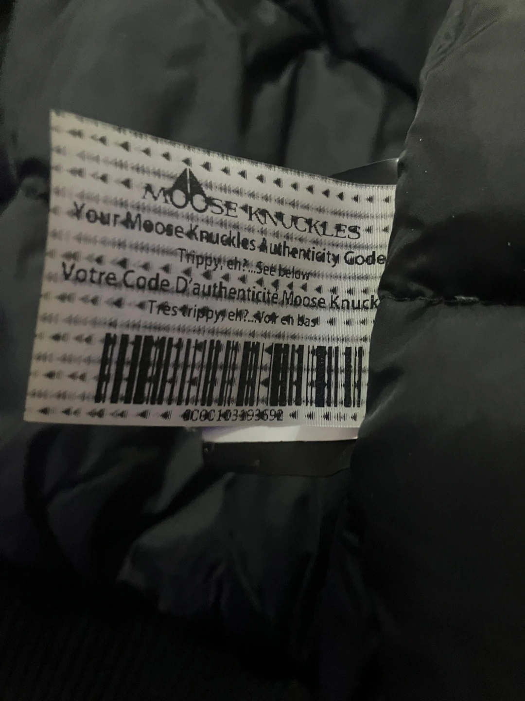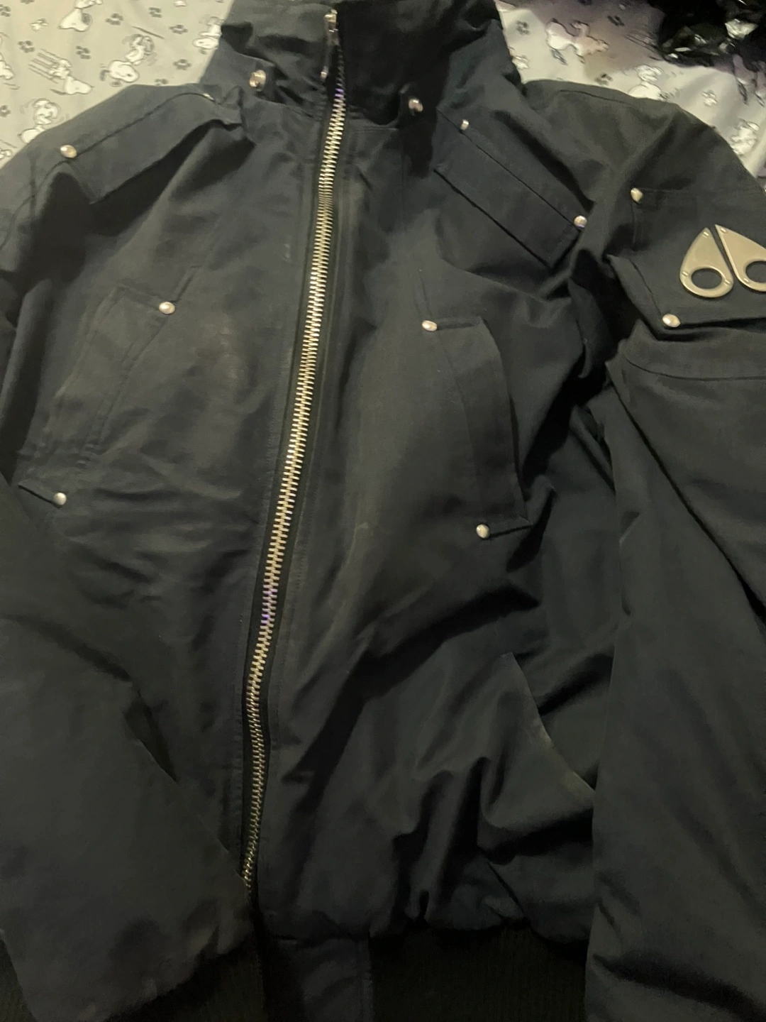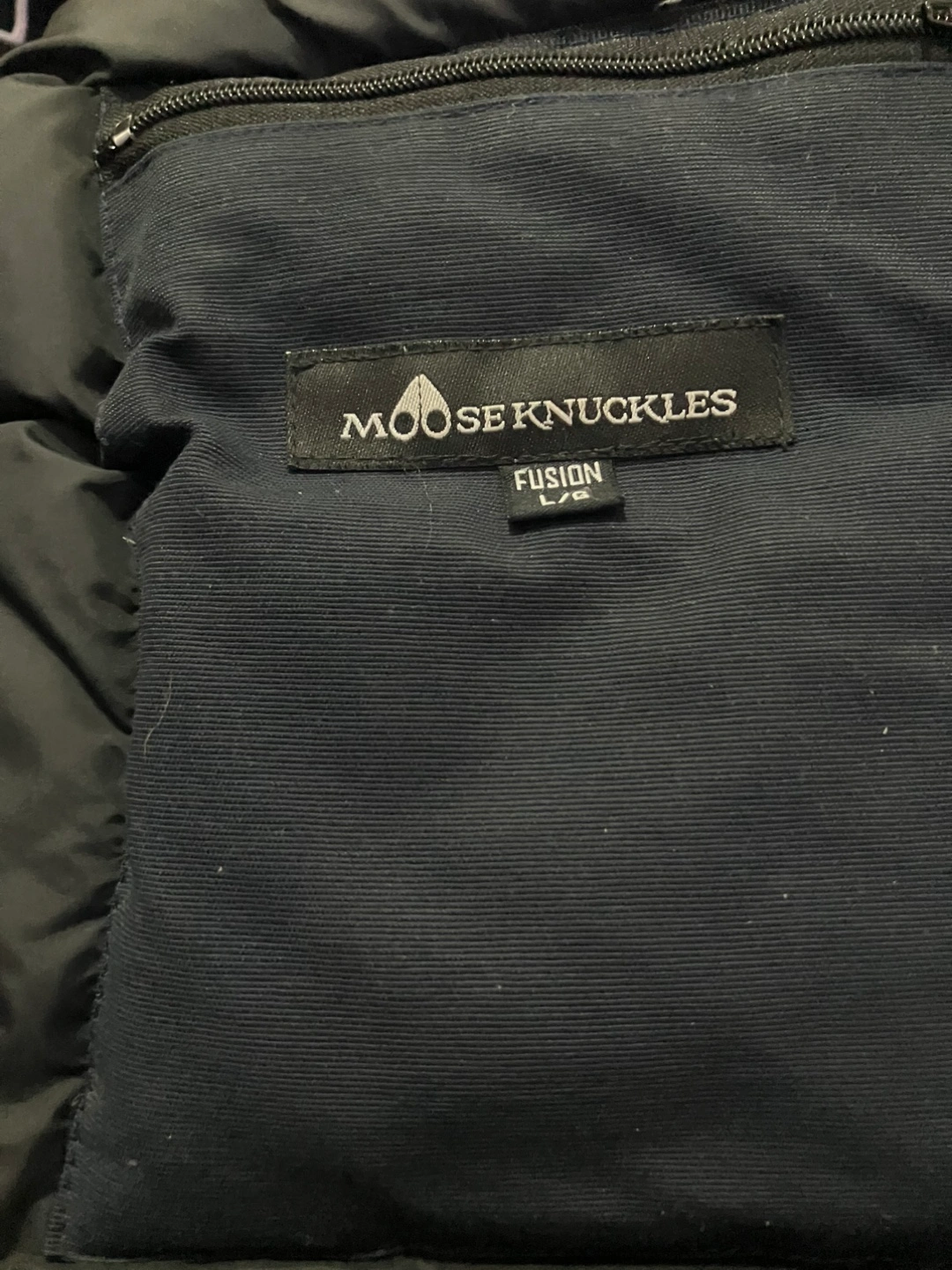 Selling a Moose Knuckles Fusion bomber jacket in size large! It's in good condition and ready for a new home. The jacket features the iconic Moose Knuckles logo on the sleeve. Perfect for staying warm and stylish during the colder months