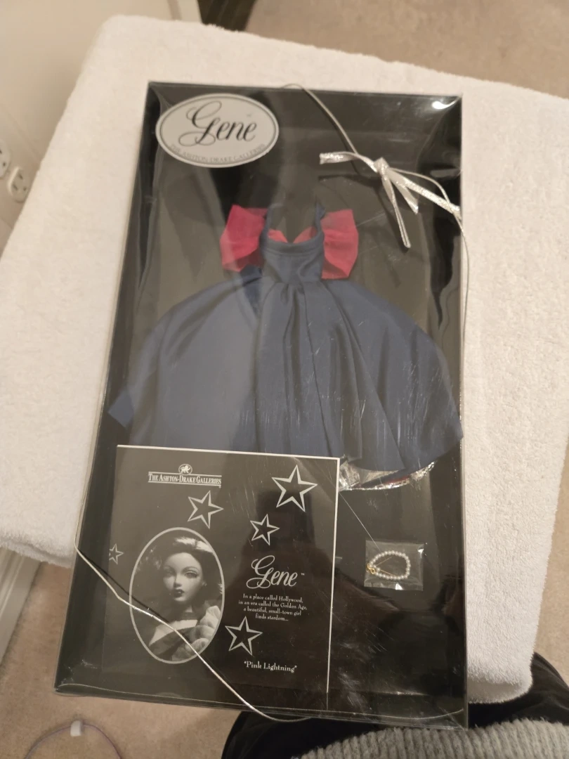 Selling brand new clothing for Gene: The Ashton Drake Galleries called "Pink Lightning." It's still in its original packaging and has never been opened. A perfect addition to any doll collection! Includes dress, necklace, purse, and shoes.