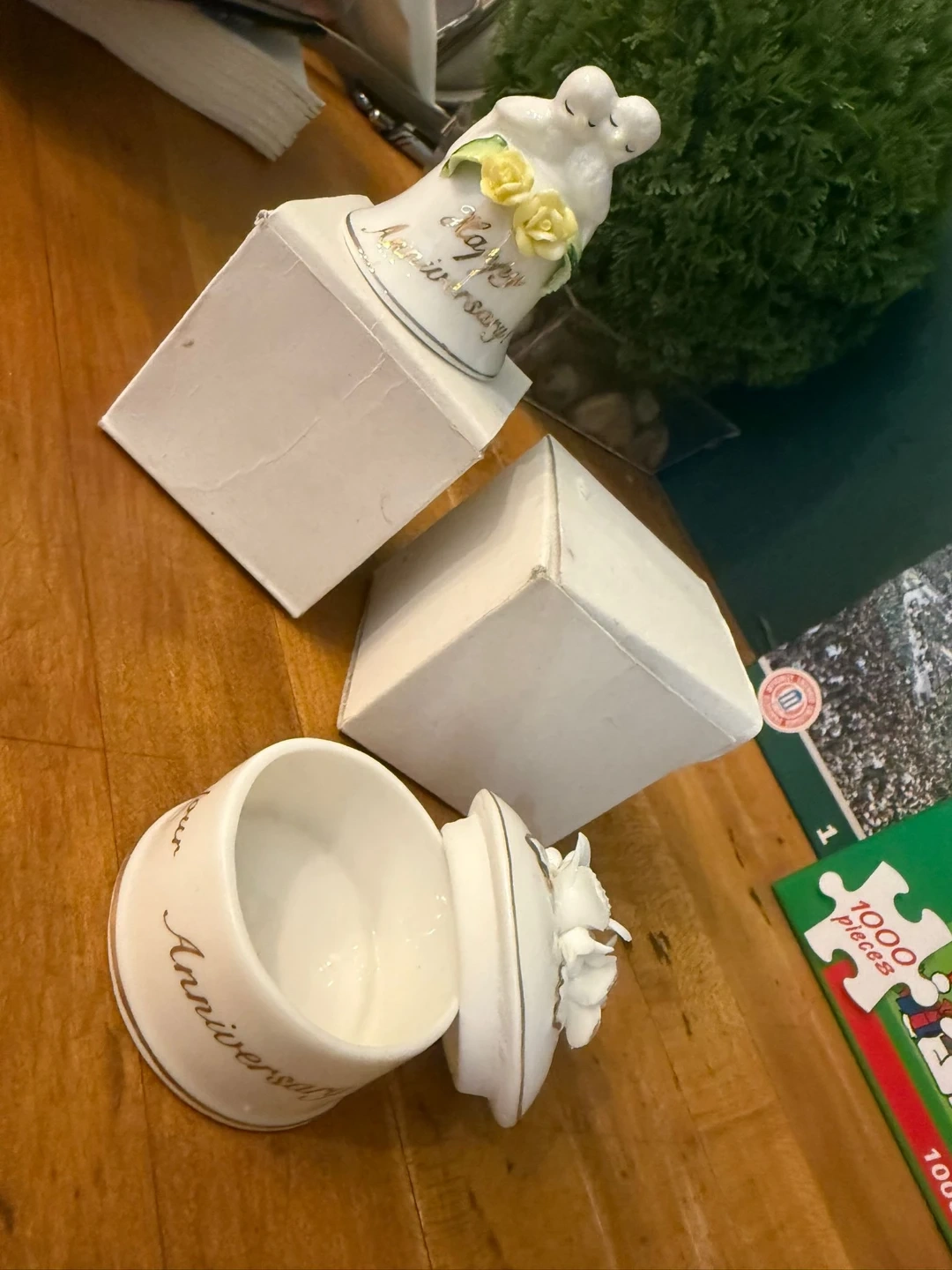 Selling a lovely anniversary keepsake box set. It includes two boxes, each with delicate floral details and gold lettering. Perfect for storing small mementos from a special anniversary celebration