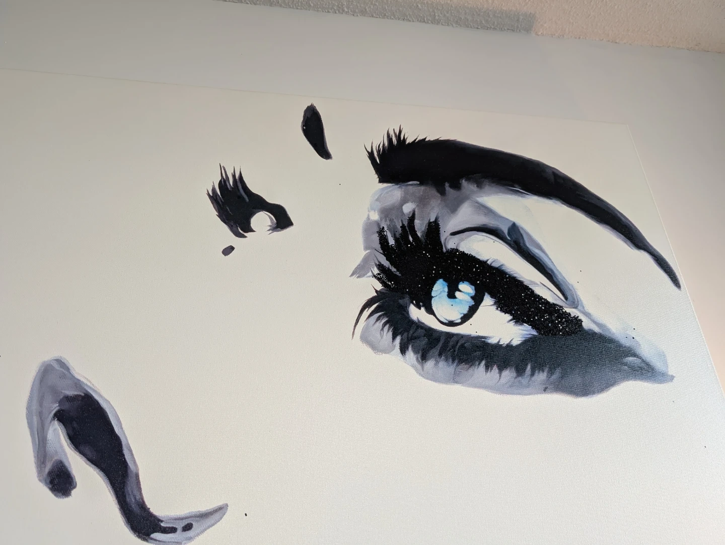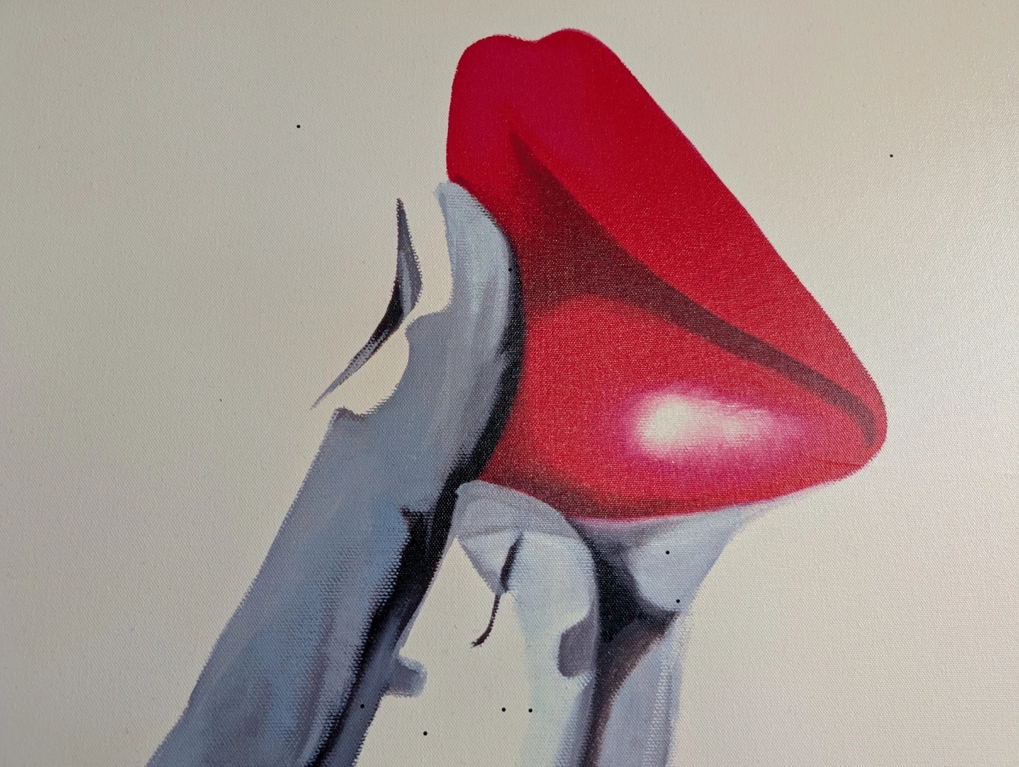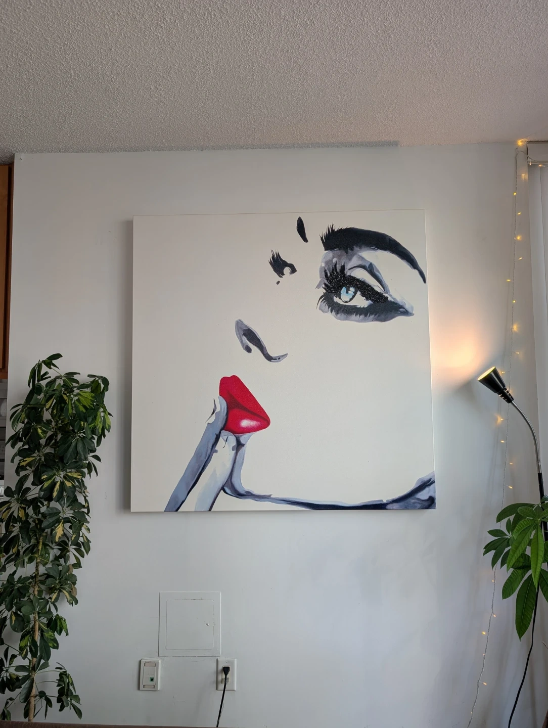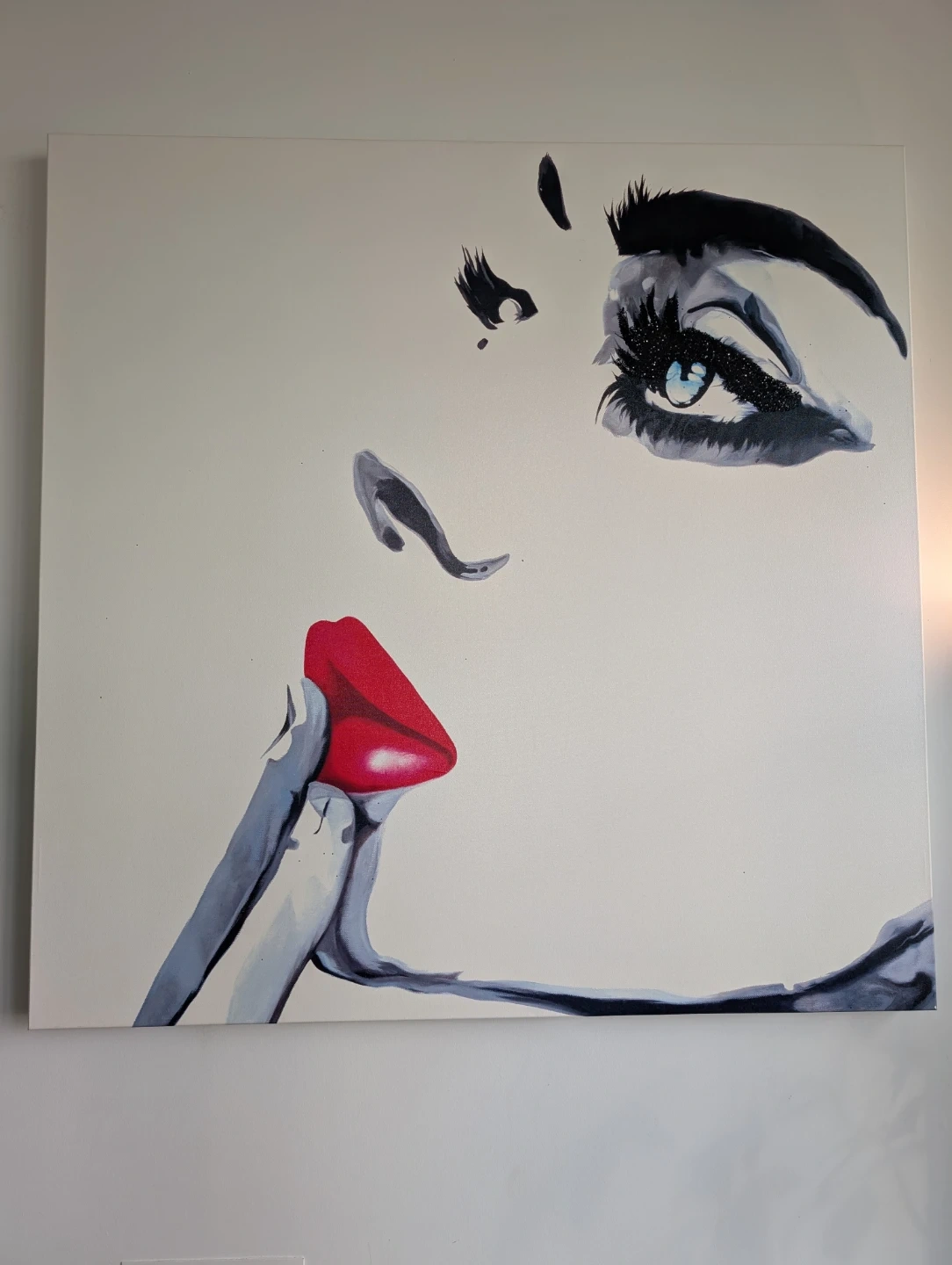 Selling a large painting on canvas. It's a striking image of a face, featuring bold red lips and a detailed eye. The canvas is in great condition and ready to hang in your home!