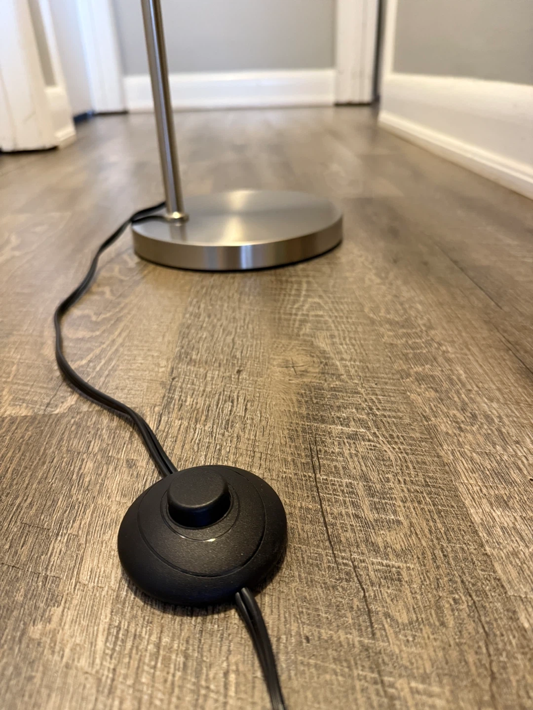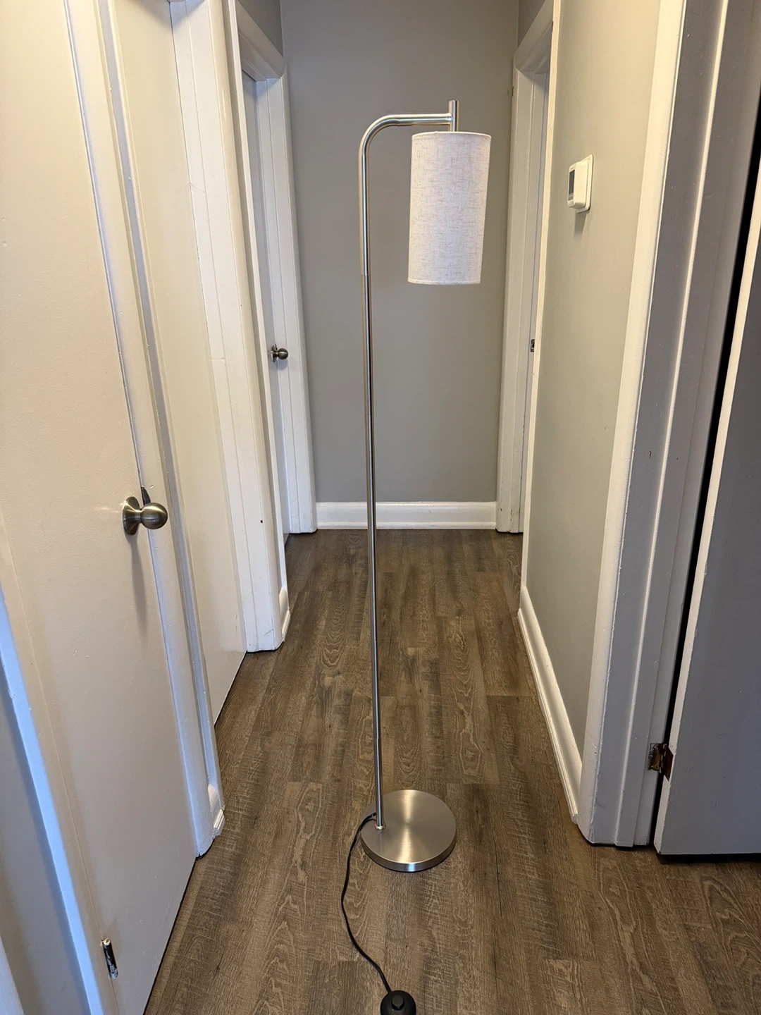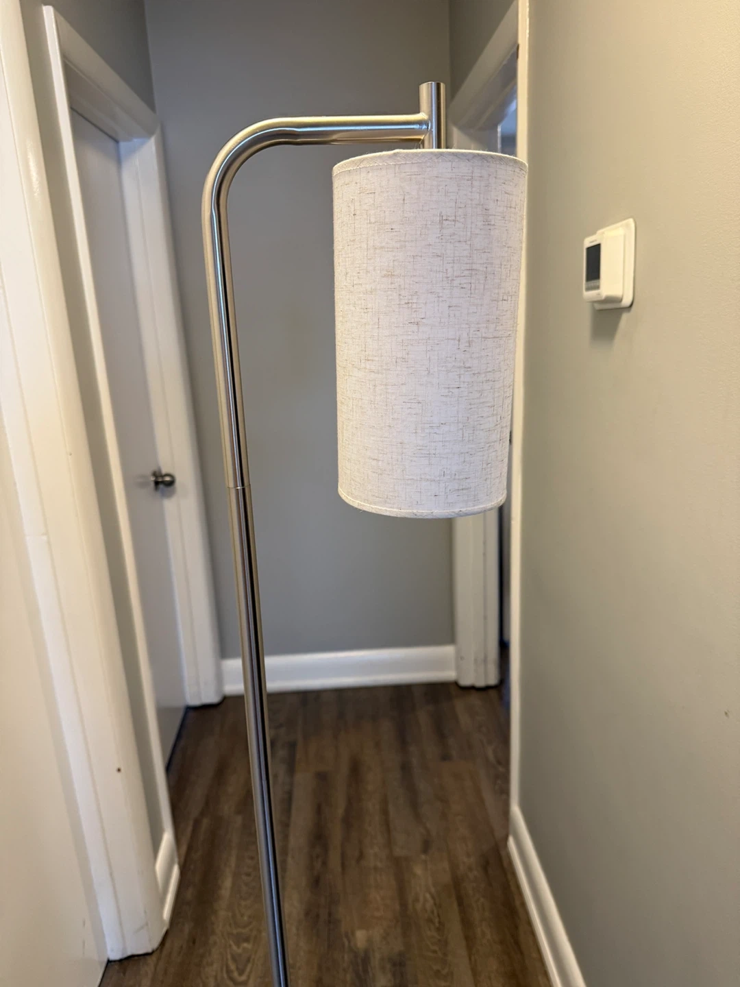 Selling a sleek silver floor lamp that will brighten up any room! It features a simple, modern design with a linen shade that diffuses light beautifully. The lamp has a convenient foot switch for easy on/off operation. Perfect for adding a touch of elegance to your living space